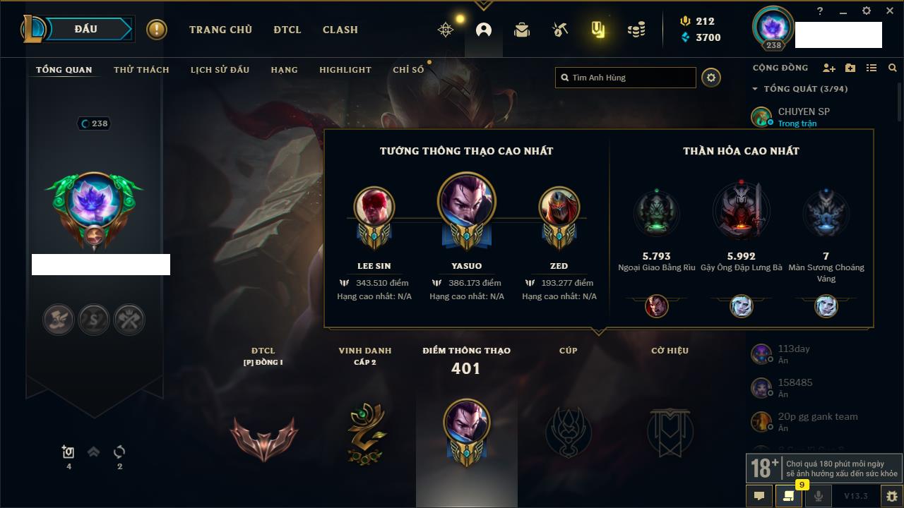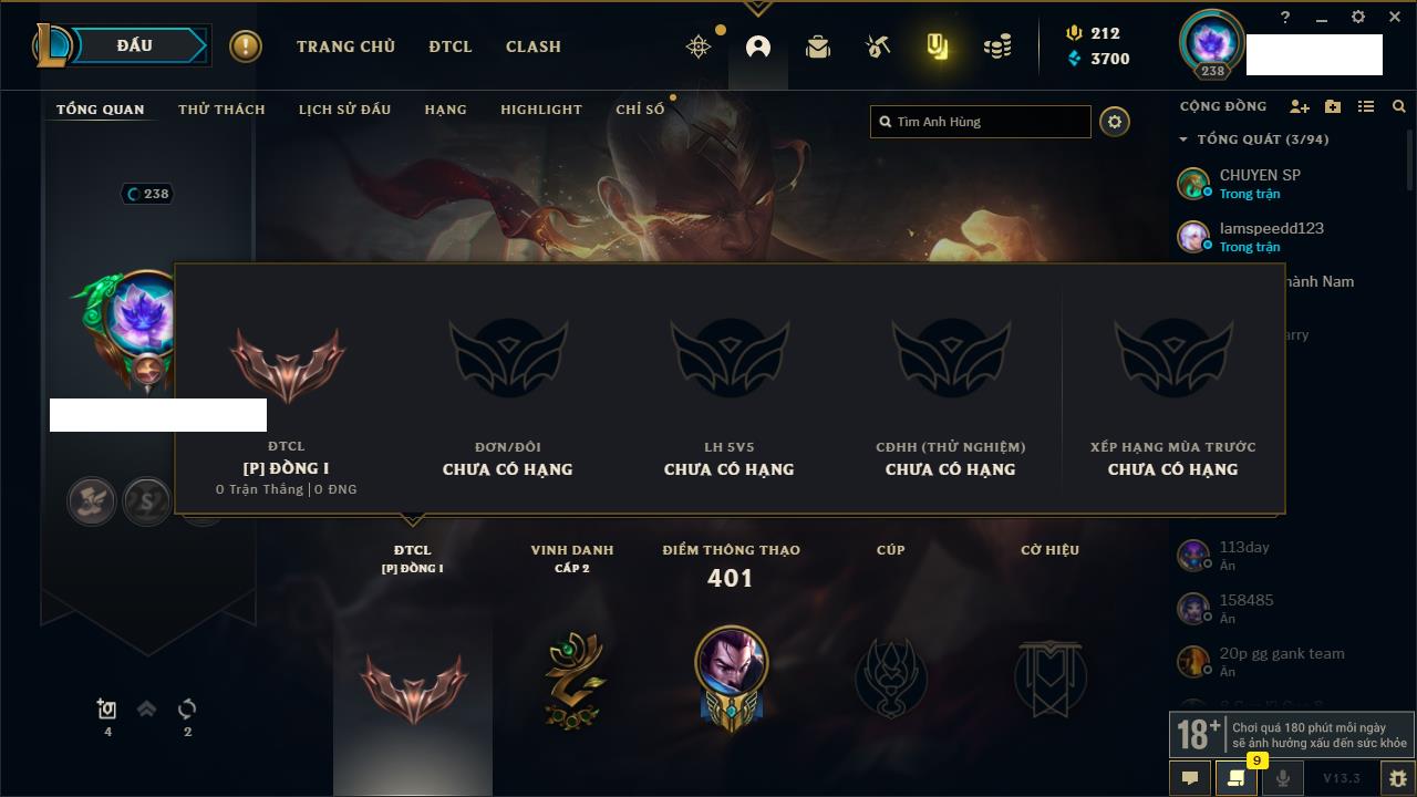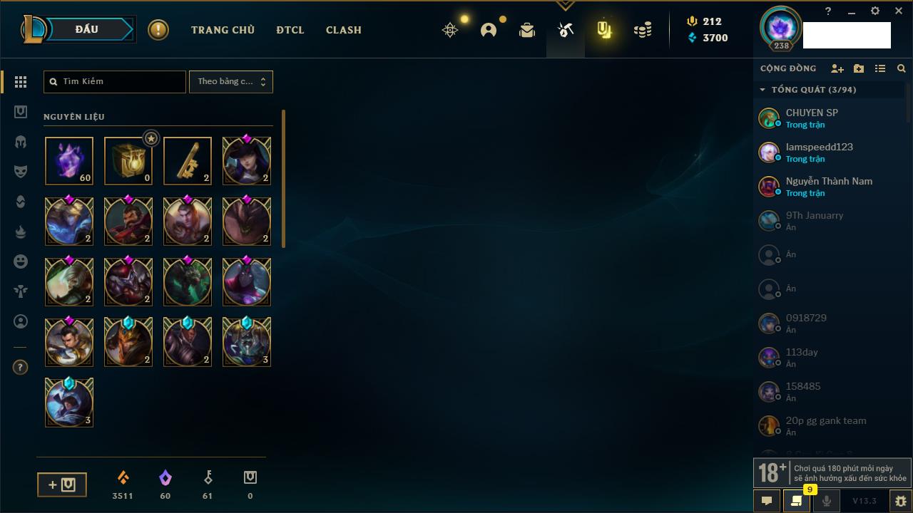 Rank Đơn: Chưa RankKhung: Chưa có khungTướng: 165 - Còn 3214 THXTrang Phục: 160Rank ĐTCL: Chưa RankLinh Thú: 28