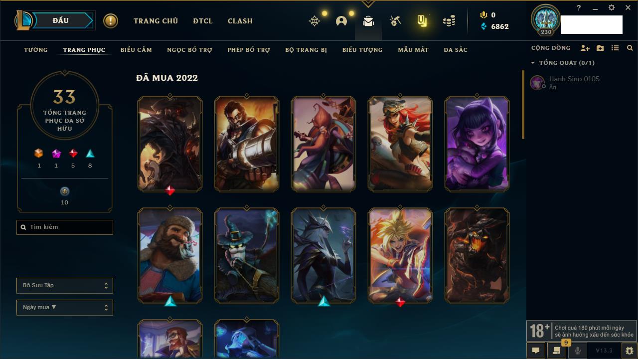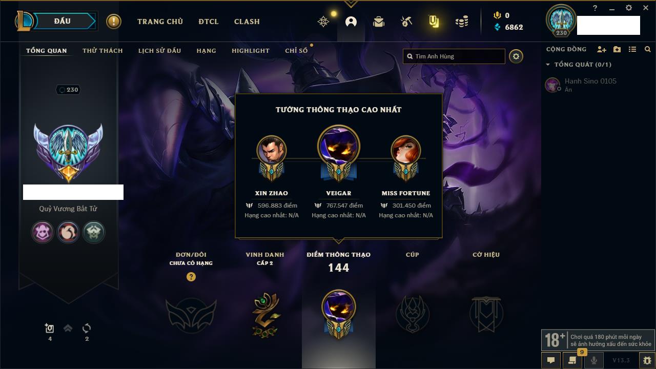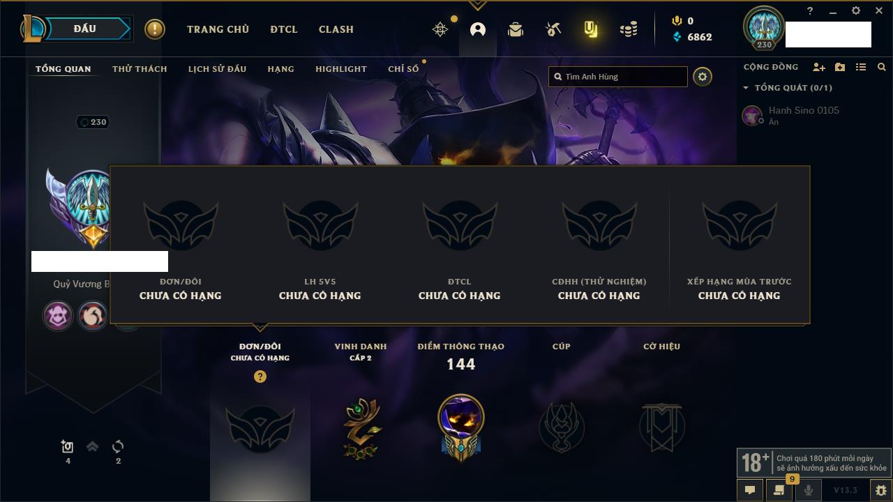 Rank Đơn: Chưa RankKhung: Chưa có khungTướng: 165 - Còn 3214 THXTrang Phục: 160Rank ĐTCL: Chưa RankLinh Thú: 28