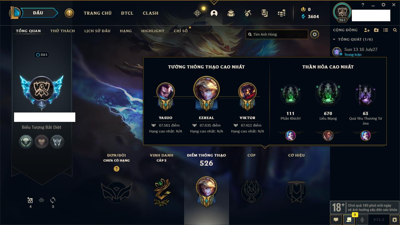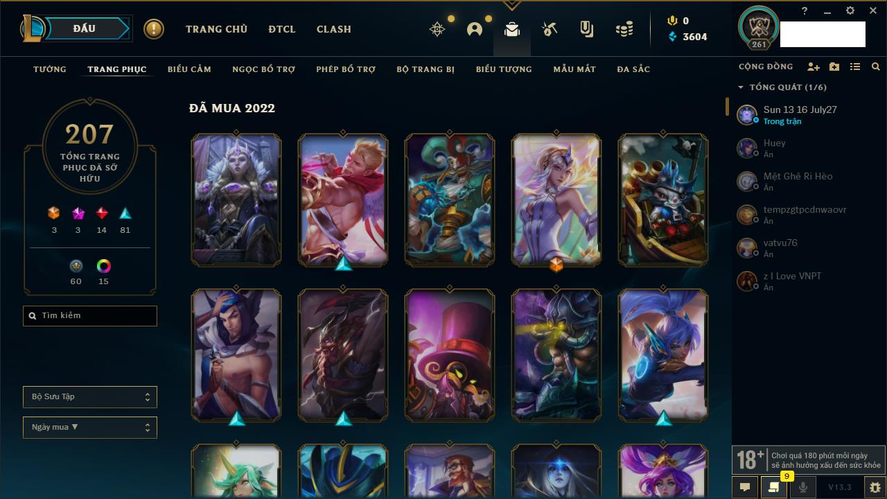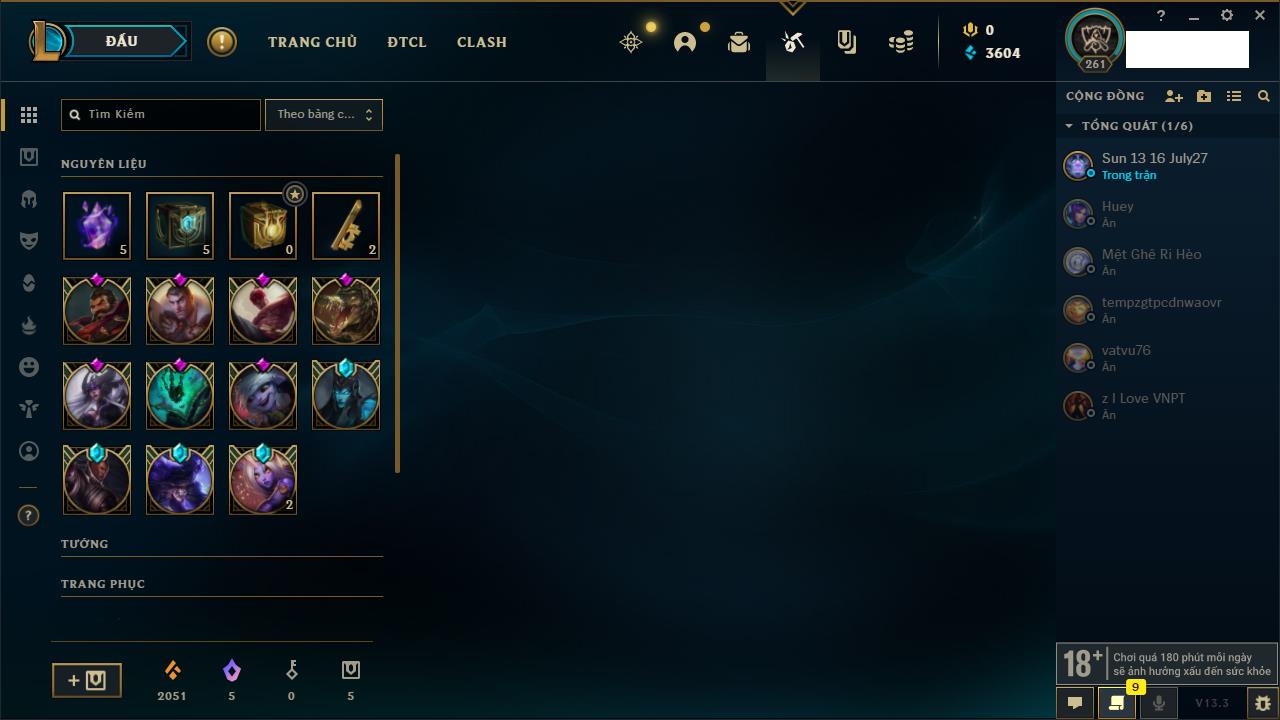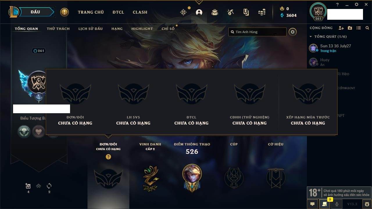 Rank Đơn: Vàng IVKhung: BạcTướng: 166 - Còn 180925 THXTrang Phục: 163Rank ĐTCL: Chưa RankLinh Thú: 67