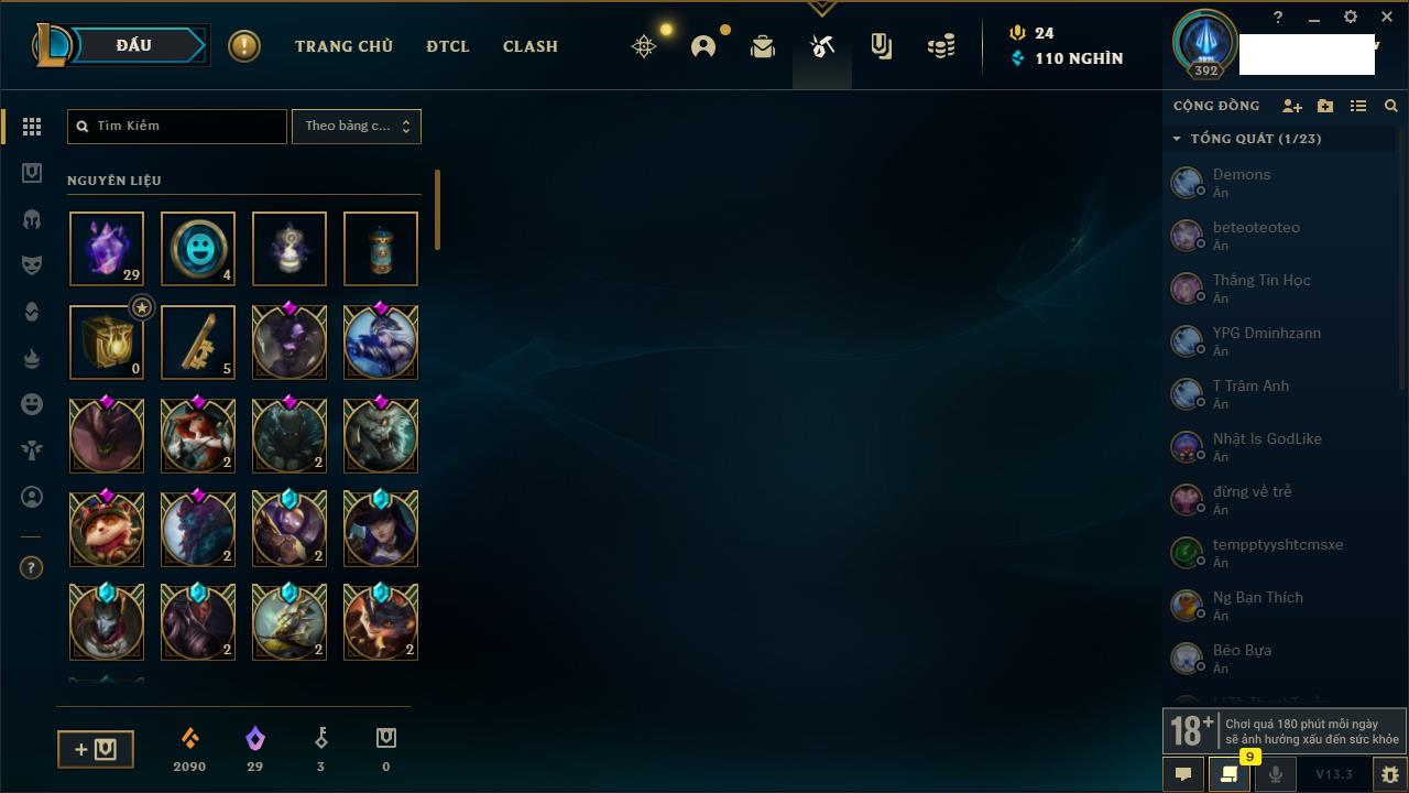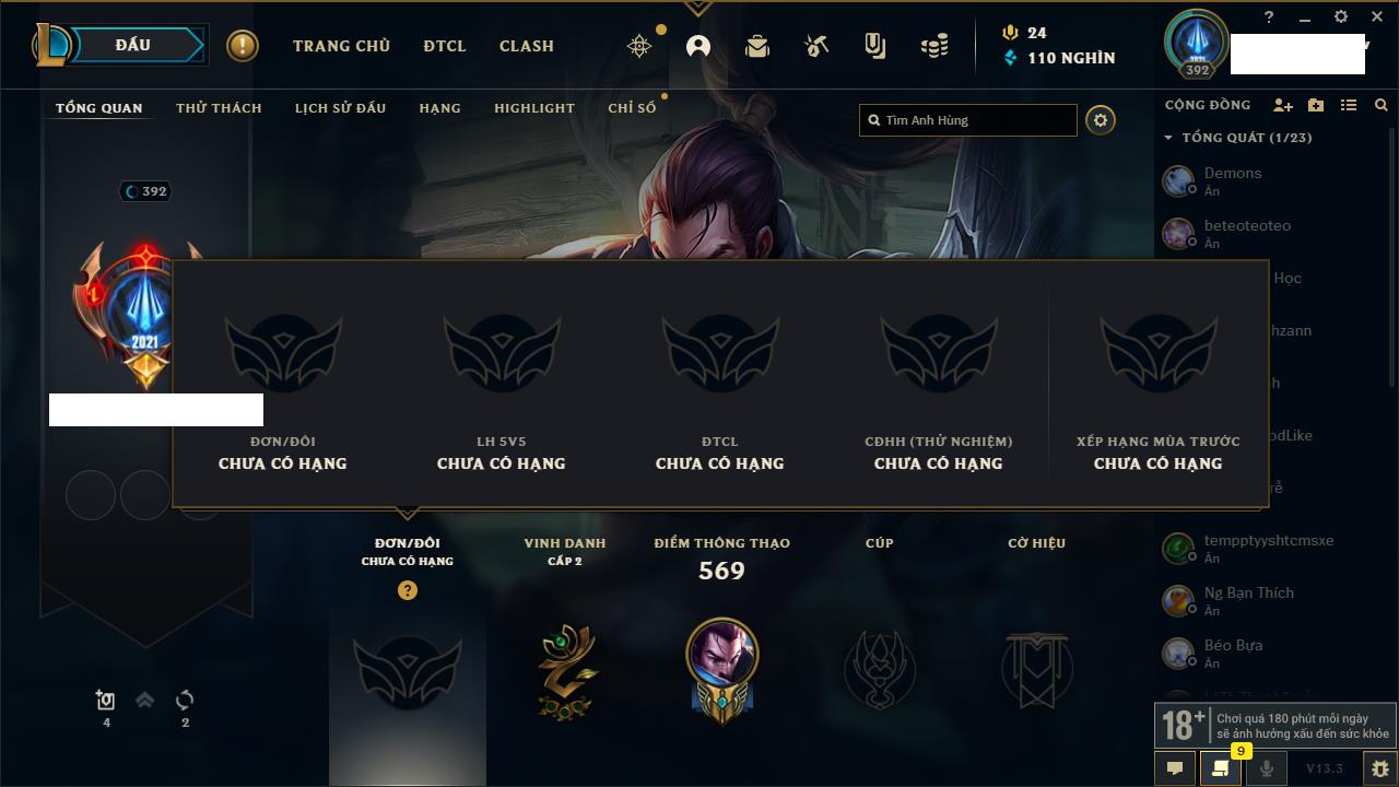 Rank Đơn: Đồng IIKhung: Chưa có khungTướng: 170 - Còn 56487 THXTrang Phục: 90Rank ĐTCL: Chưa RankLinh Thú: 129