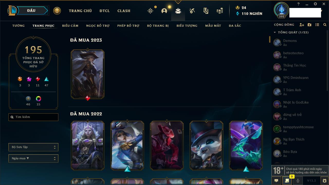 Rank Đơn: Vàng IIIKhung: VàngTướng: 170 - Còn 33222 THXTrang Phục: 136Rank ĐTCL: Chưa RankLinh Thú: 40
