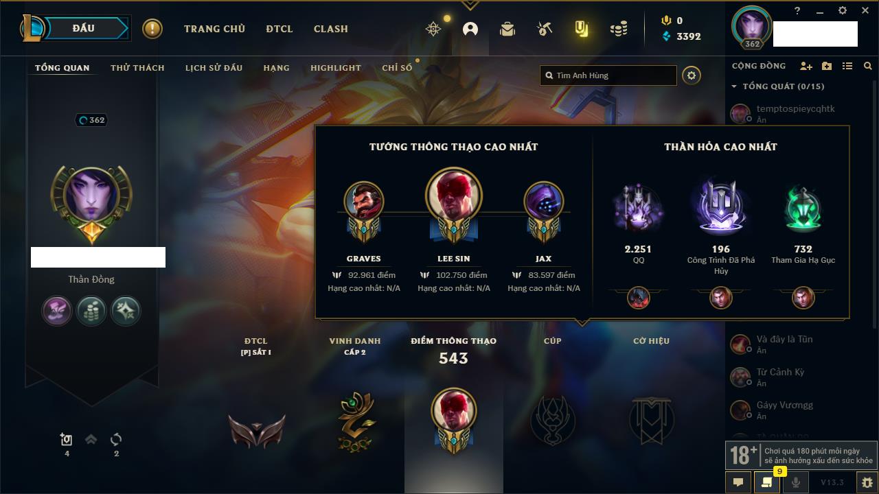 Rank Đơn: Vàng IIKhung: VàngTướng: 171 - Còn 219803 THXTrang Phục: 254Rank ĐTCL: Chưa RankLinh Thú: 78