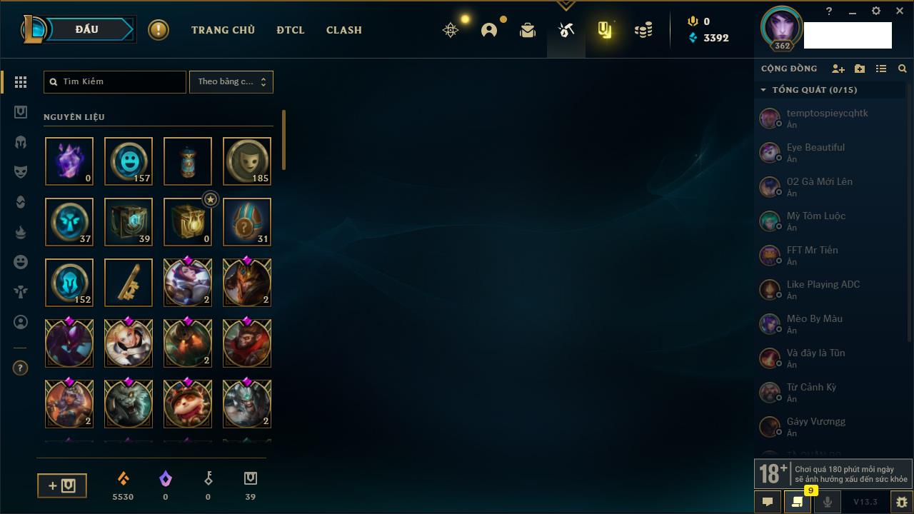 Rank Đơn: Bạch Kim IVKhung: VàngTướng: 171 - Còn 130280 THXTrang Phục: 226Rank ĐTCL: Kim Cương IVLinh Thú: 183
