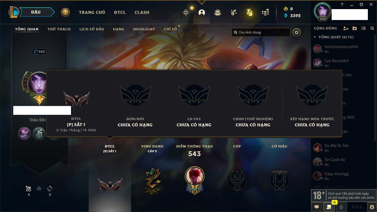 Rank Đơn: Sắt IIIKhung: SắtTướng: 171 - Còn 62070 THXTrang Phục: 198Rank ĐTCL: Bạch Kim IIILinh Thú: 237