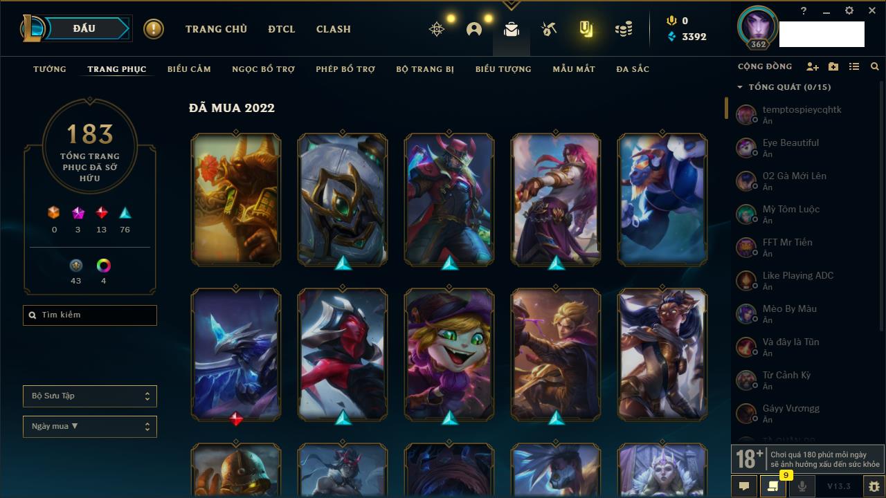 Rank Đơn: Vàng IIIKhung: Bạch kimTướng: 171 - Còn 98230 THXTrang Phục: 235Rank ĐTCL: Vàng IVLinh Thú: 59