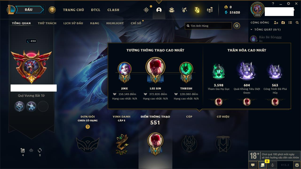 Rank Đơn: Bạch Kim IIIKhung: VàngTướng: 126 - Còn 23055 THXTrang Phục: 114Rank ĐTCL: Chưa RankLinh Thú: 21