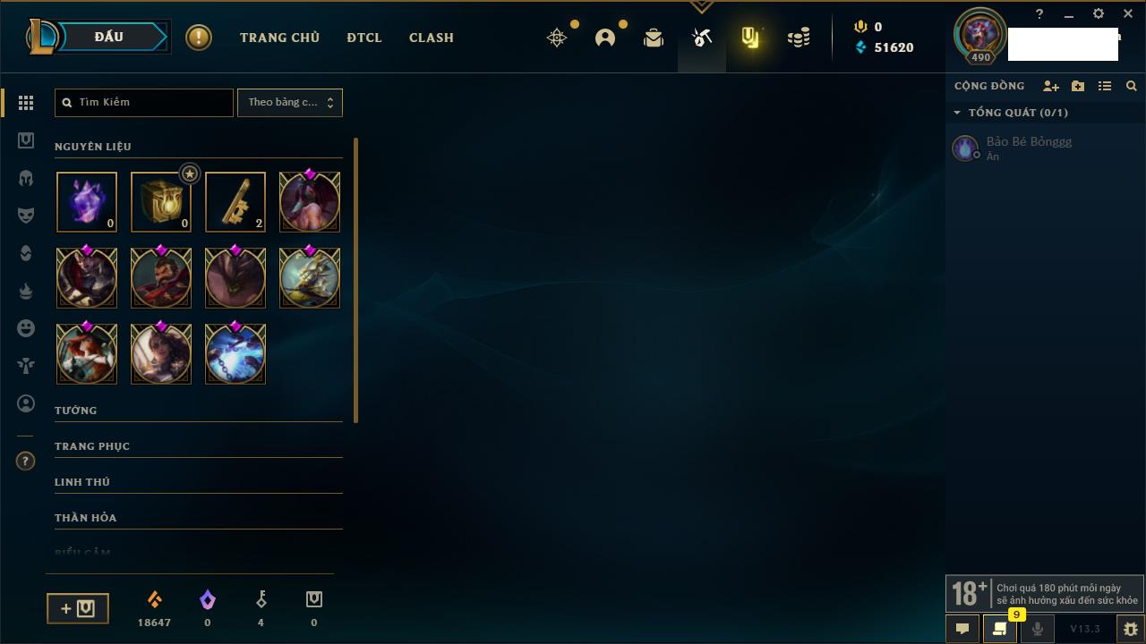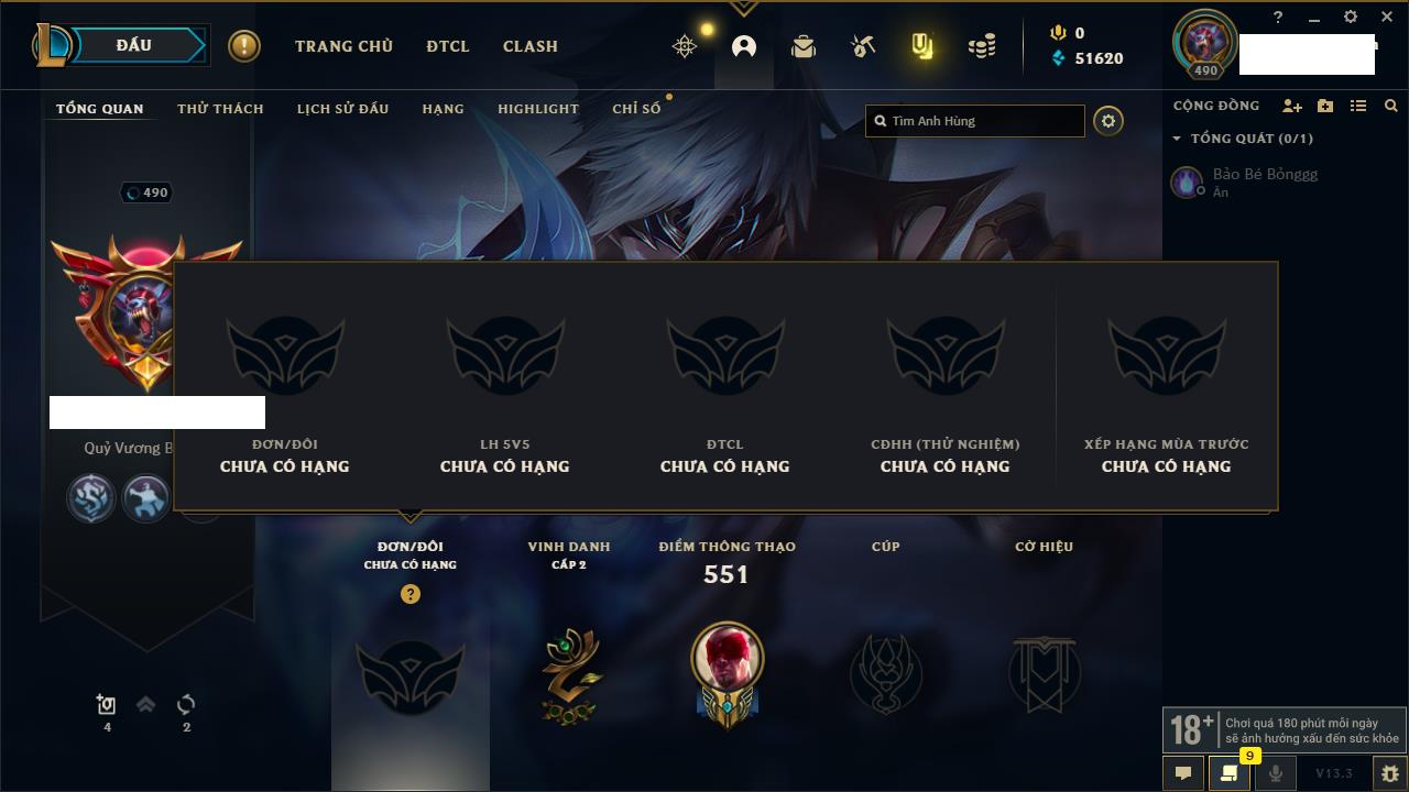 Rank Đơn: Bạc IIIKhung: Chưa có khungTướng: 171 - Còn 21493 THXTrang Phục: 252Rank ĐTCL: Bạch Kim IVLinh Thú: 123