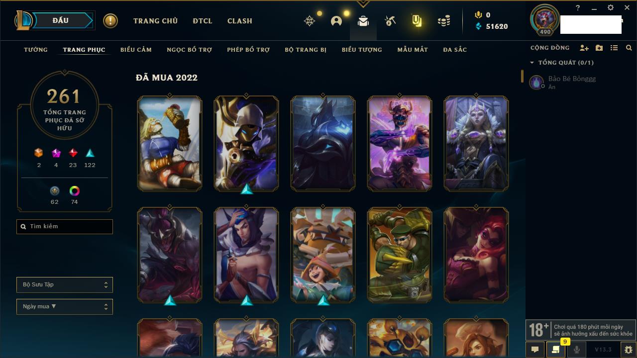 Rank Đơn: Vàng IIIKhung: VàngTướng: 161 - Còn 162202 THXTrang Phục: 179Rank ĐTCL: Chưa RankLinh Thú: 20