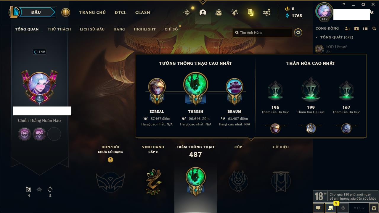 Rank Đơn: Chưa RankKhung: Chưa có khungTướng: 157 - Còn 6783 THXTrang Phục: 50Rank ĐTCL: Chưa RankLinh Thú: 37