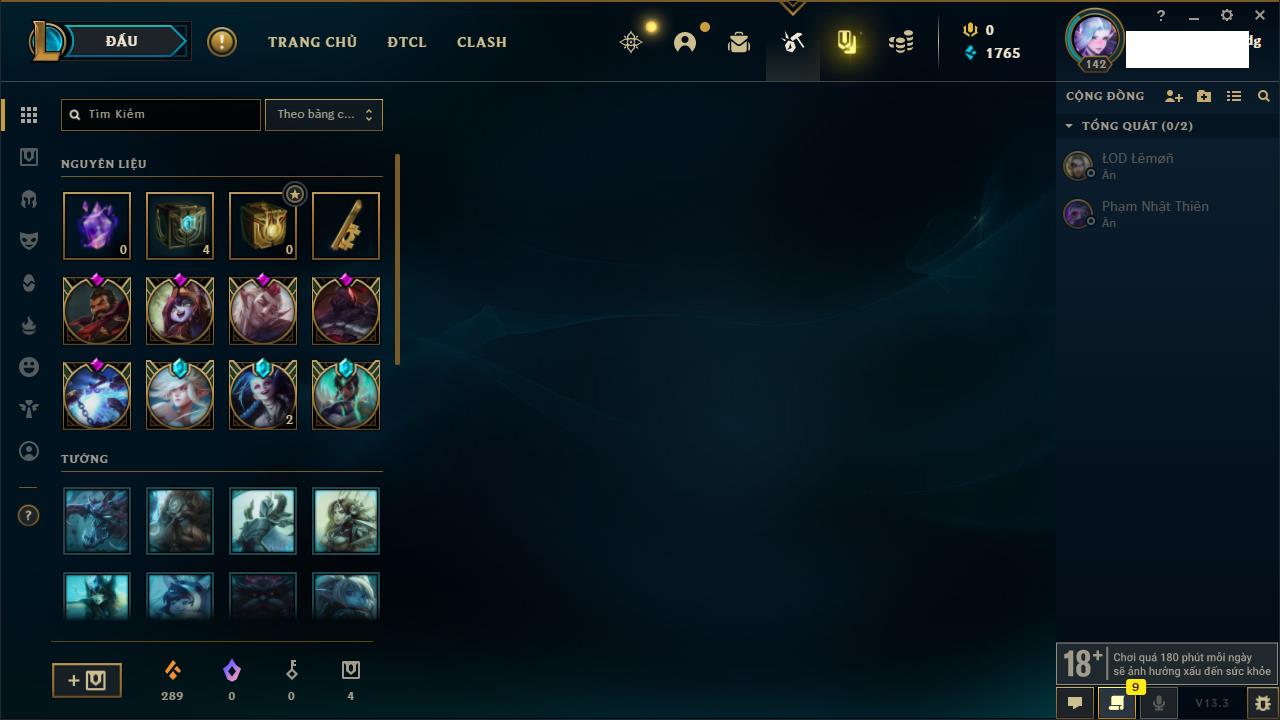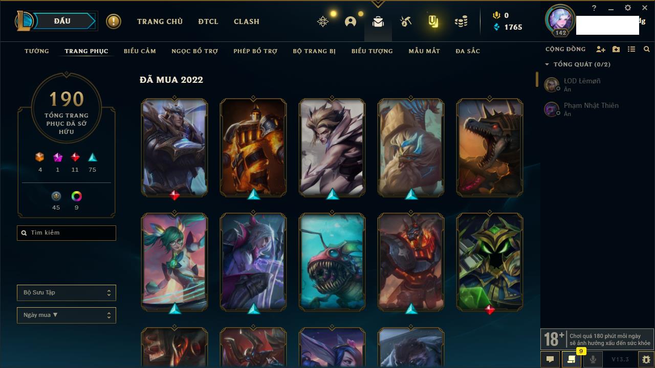 Rank Đơn: Vàng IIIKhung: VàngTướng: 170 - Còn 33222 THXTrang Phục: 136Rank ĐTCL: Chưa RankLinh Thú: 40