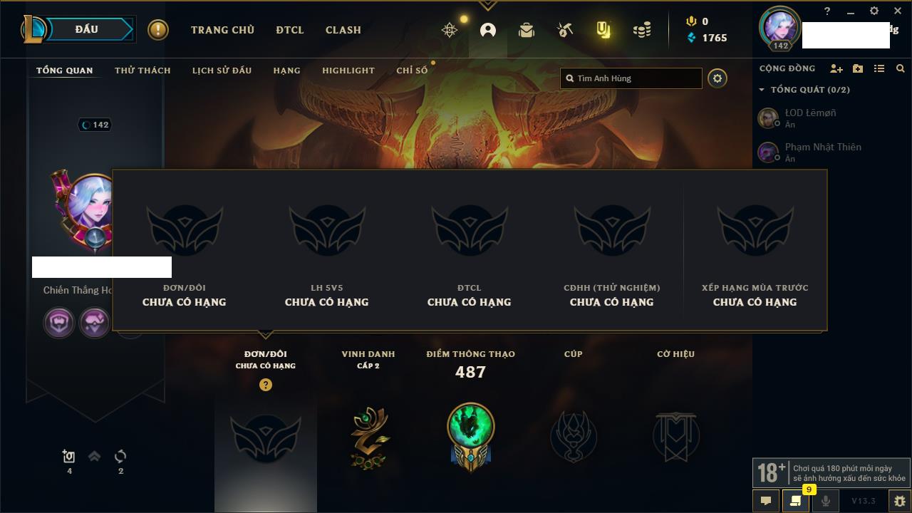 Rank Đơn: Đồng IIKhung: Chưa có khungTướng: 170 - Còn 56487 THXTrang Phục: 90Rank ĐTCL: Chưa RankLinh Thú: 129