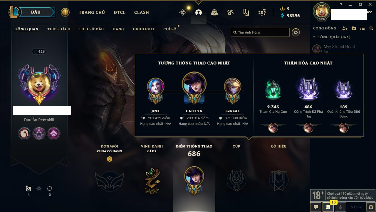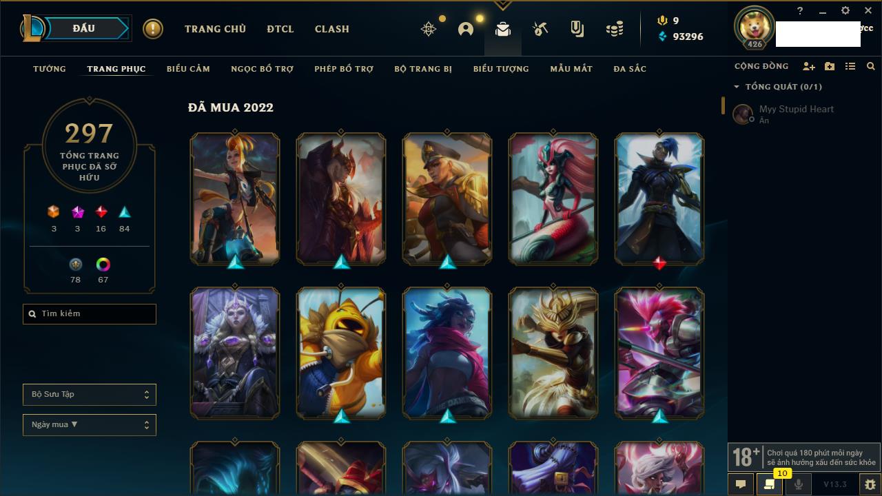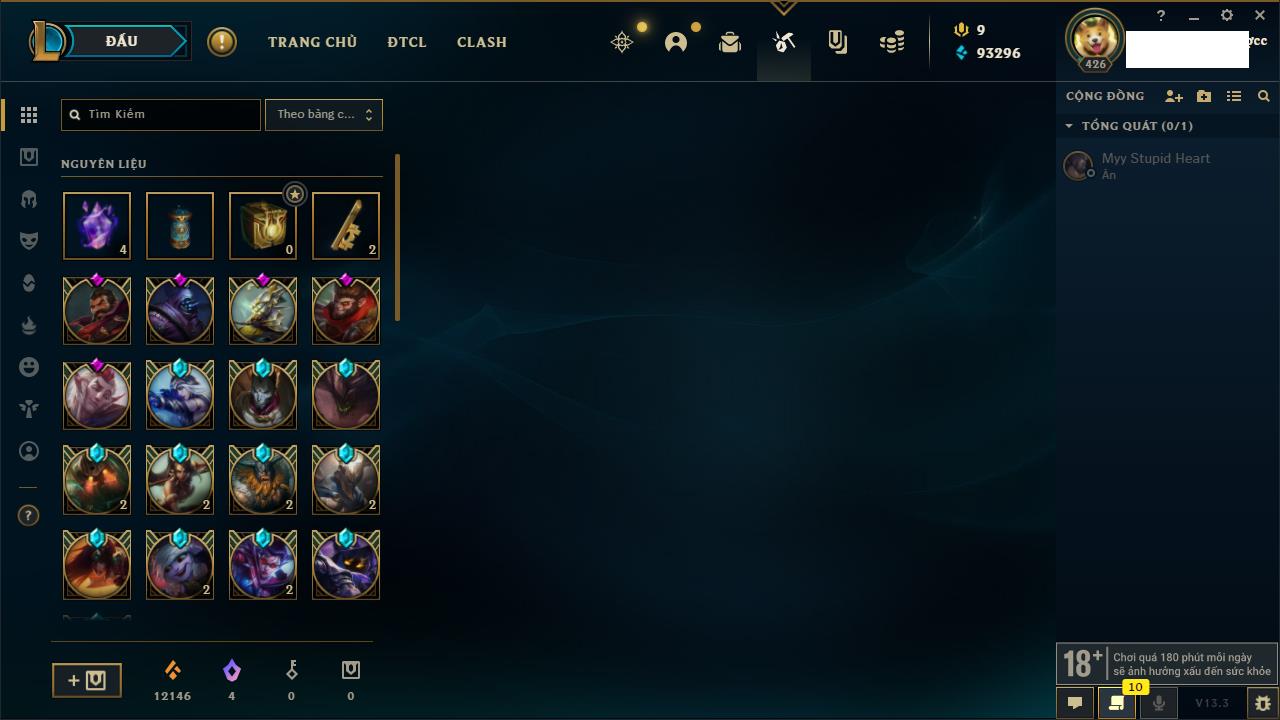 Rank Đơn: Vàng IKhung: Bạch kimTướng: 170 - Còn 212450 THXTrang Phục: 214Rank ĐTCL: Bạch Kim IVLinh Thú: 221