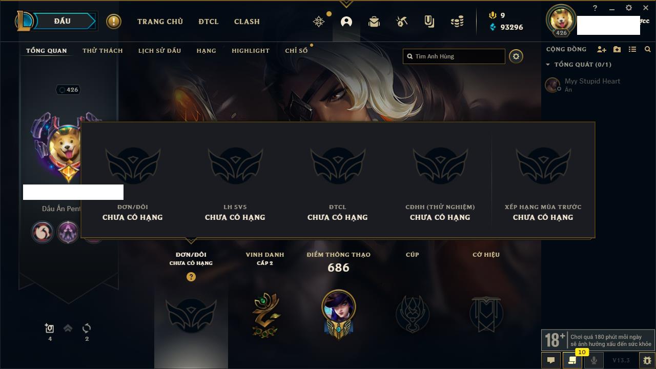 Rank Đơn: Bạch Kim IIKhung: Bạch kimTướng: 171 - Còn 263986 THXTrang Phục: 306Rank ĐTCL: Lục Bảo IVLinh Thú: 96