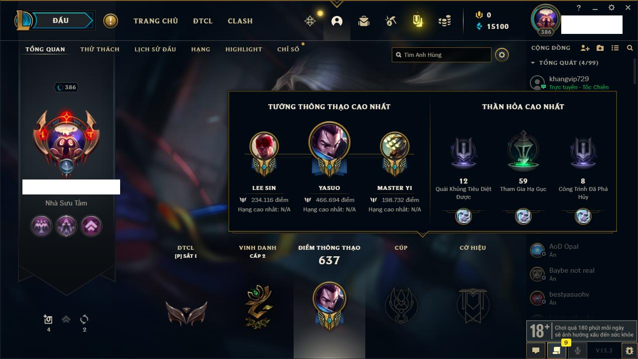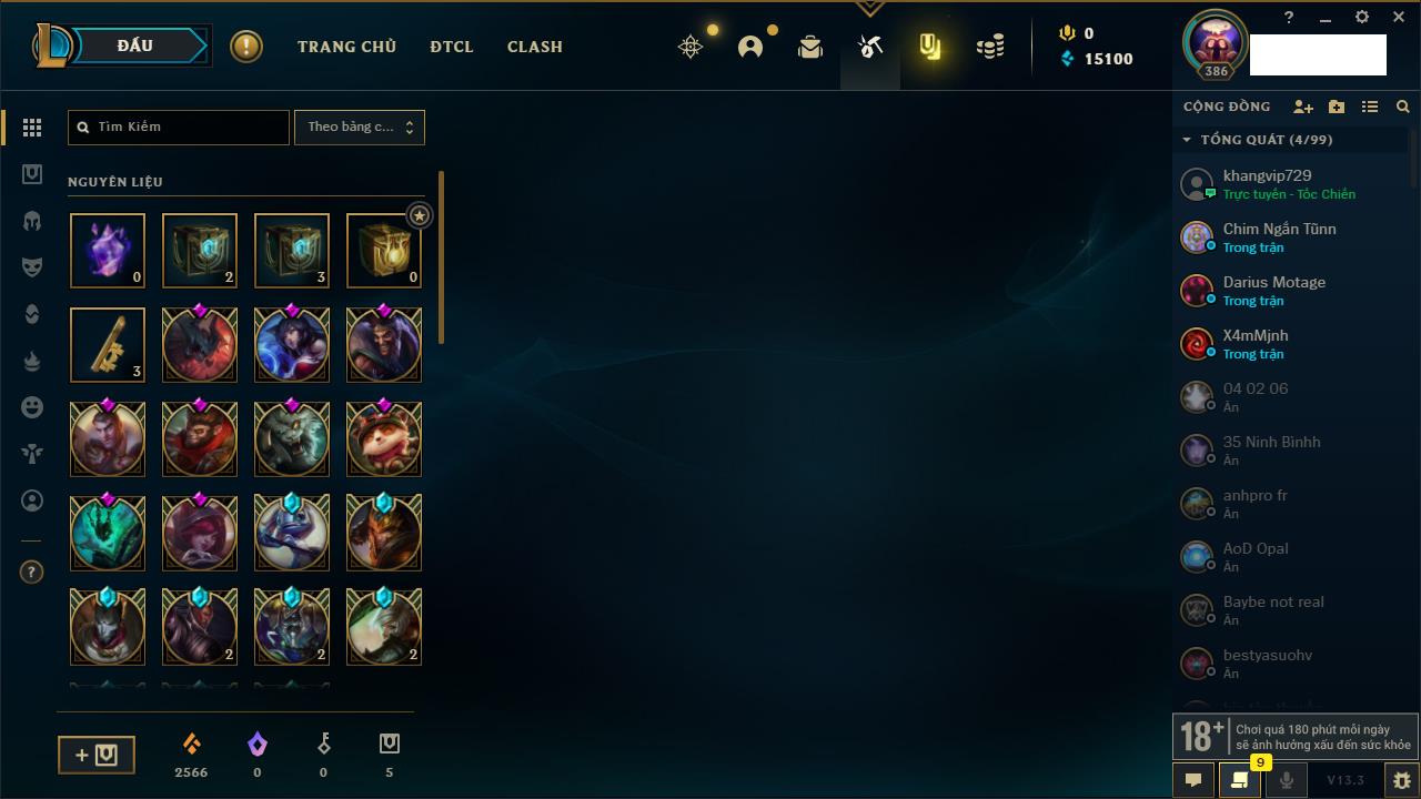 Rank Đơn: Đồng IIKhung: Chưa có khungTướng: 170 - Còn 56487 THXTrang Phục: 90Rank ĐTCL: Chưa RankLinh Thú: 129