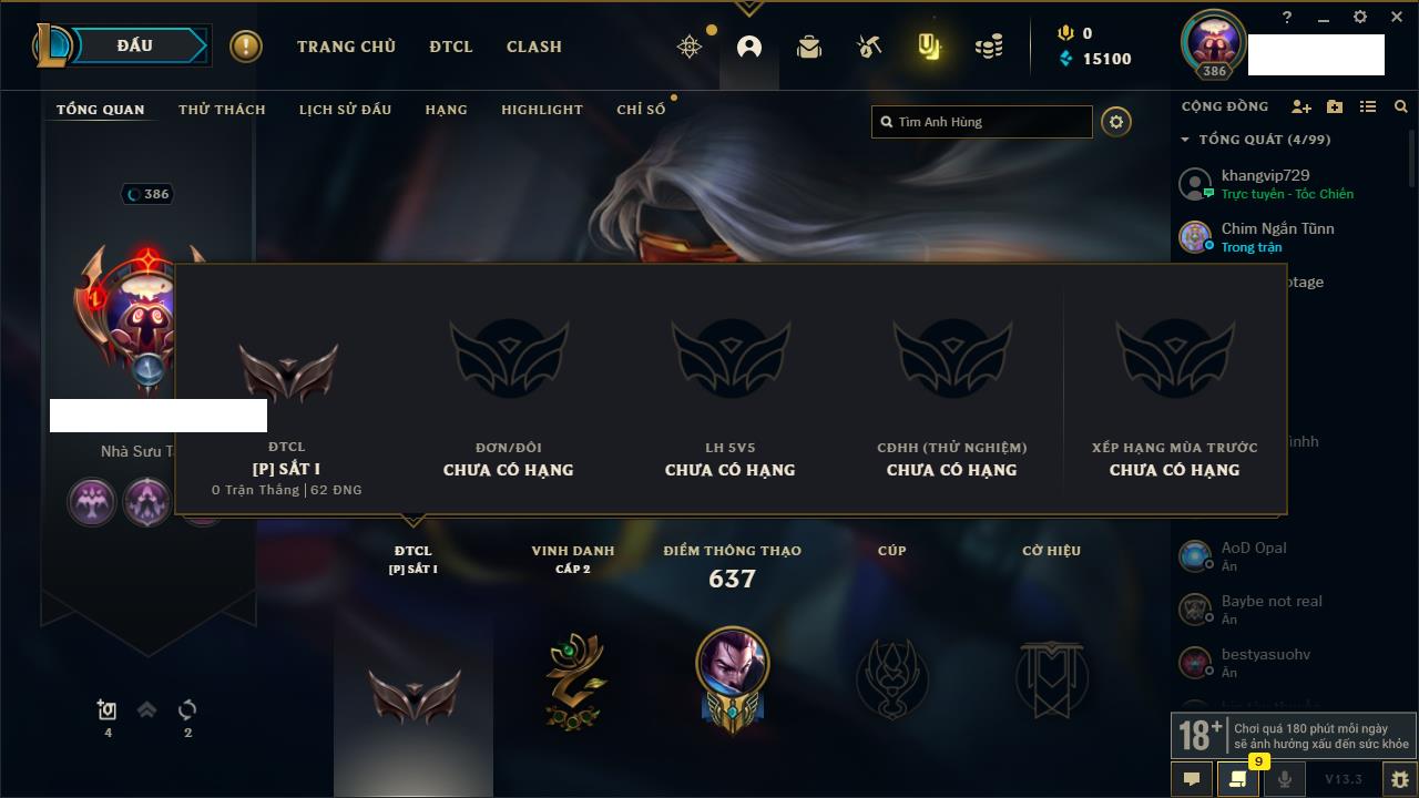 Rank Đơn: Đồng IIIKhung: ĐồngTướng: 171 - Còn 54778 THXTrang Phục: 96Rank ĐTCL: Bạch Kim IIILinh Thú: 140