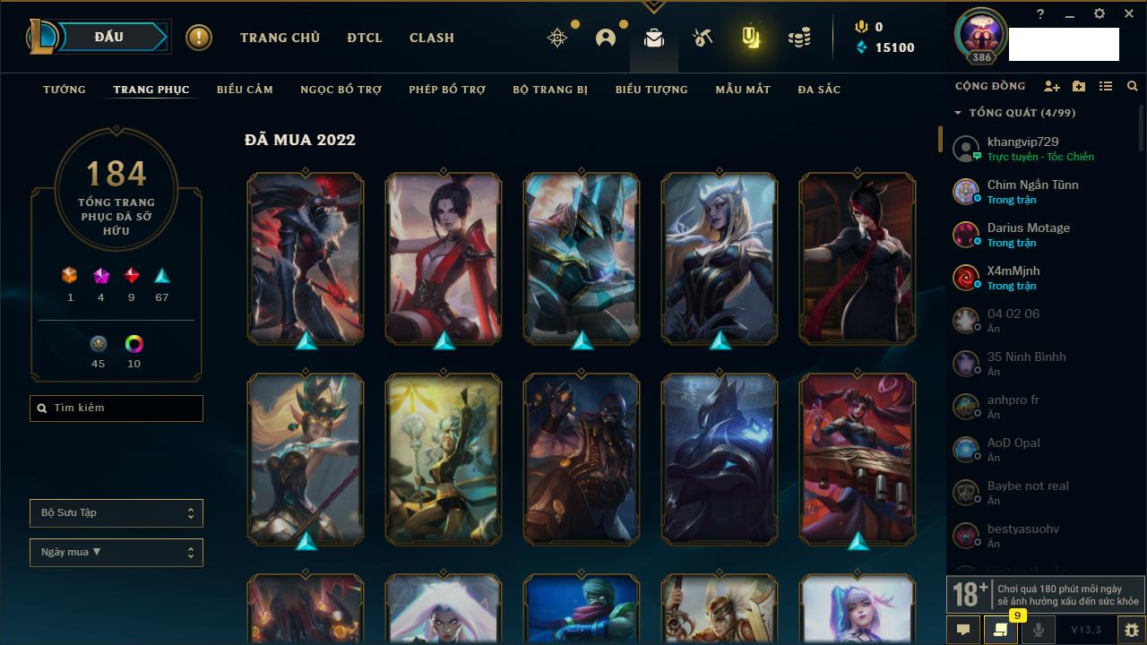 Rank Đơn: Vàng IIIKhung: VàngTướng: 170 - Còn 33222 THXTrang Phục: 136Rank ĐTCL: Chưa RankLinh Thú: 40