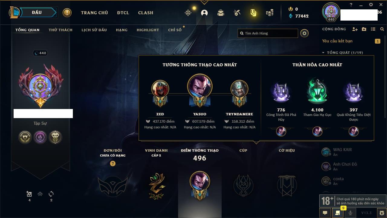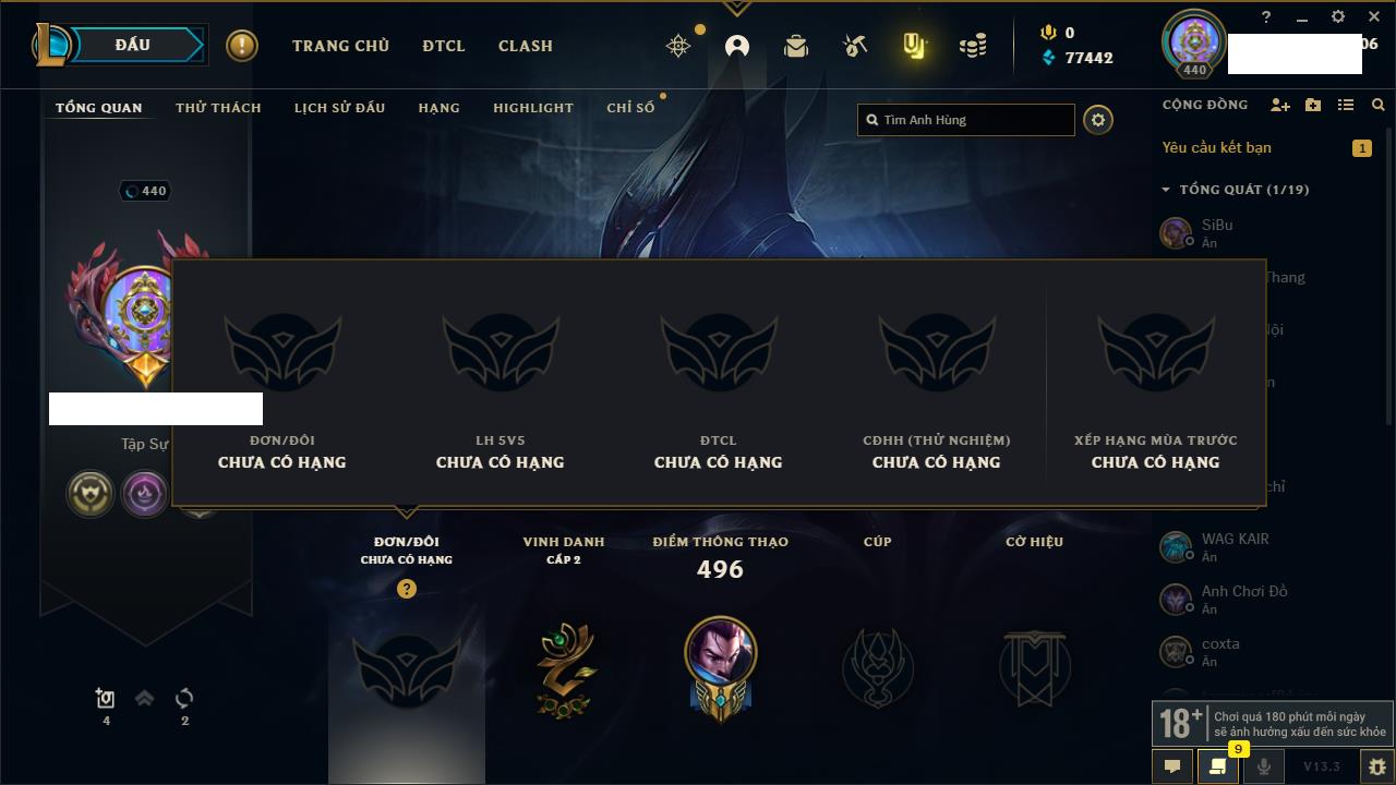 Rank Đơn: Chưa rank mùa nào Khung: Chưa có khung Tướng: 0 - Còn 2000 THX Trang Phục: 0 Rank ĐTCL: Chưa Rank Linh Thú: 14