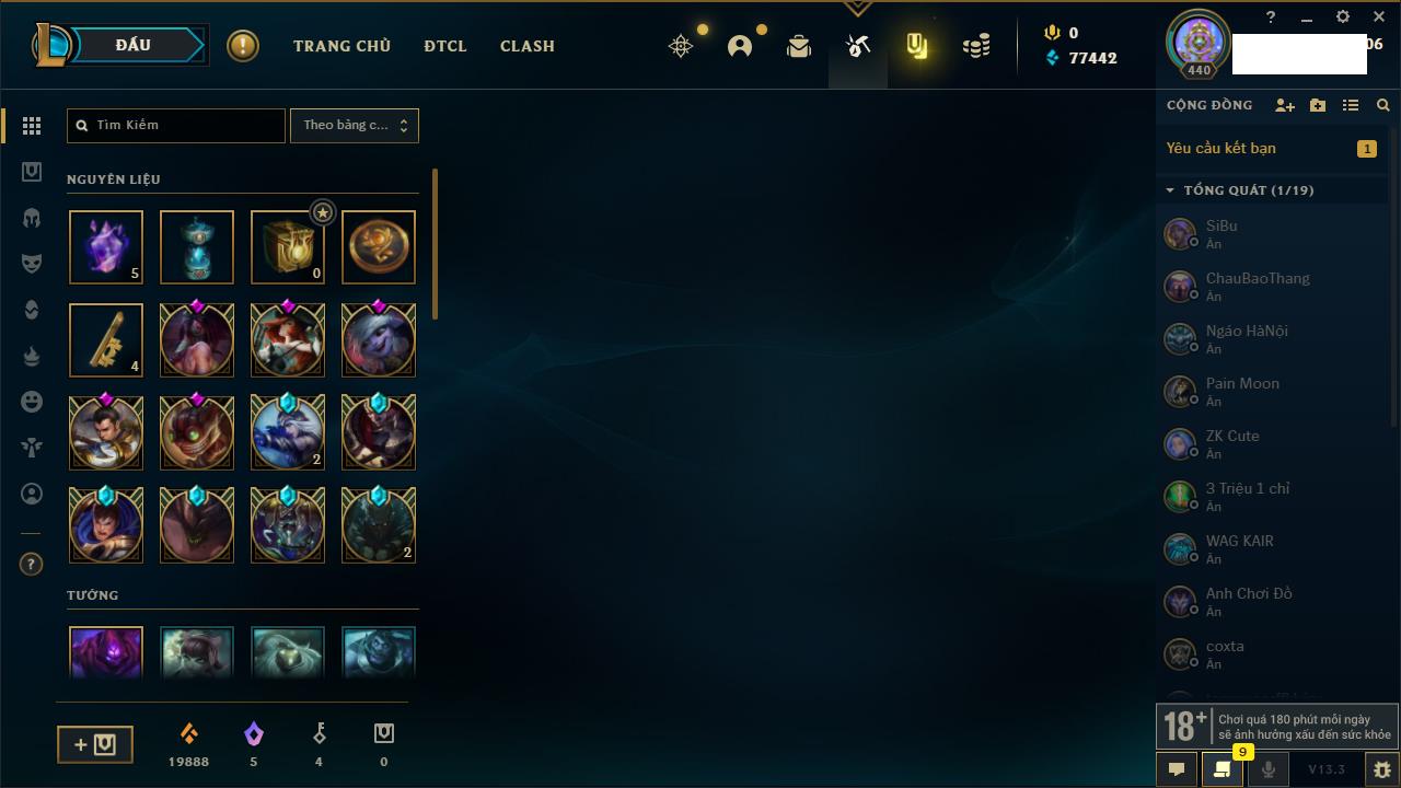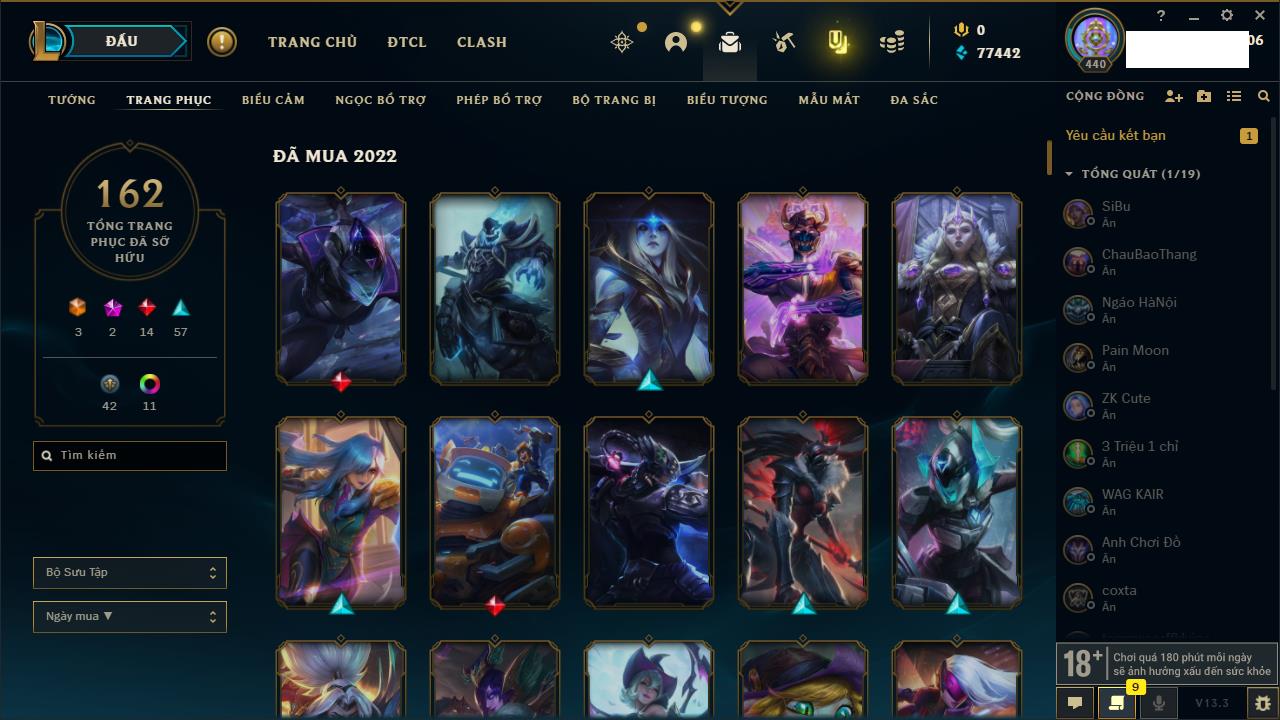 Rank Đơn: Chưa Rank Khung: Chưa có khung Tướng: 159 - Còn 6080 THX Trang Phục: 136 Rank ĐTCL: Chưa Rank Linh Thú: 29