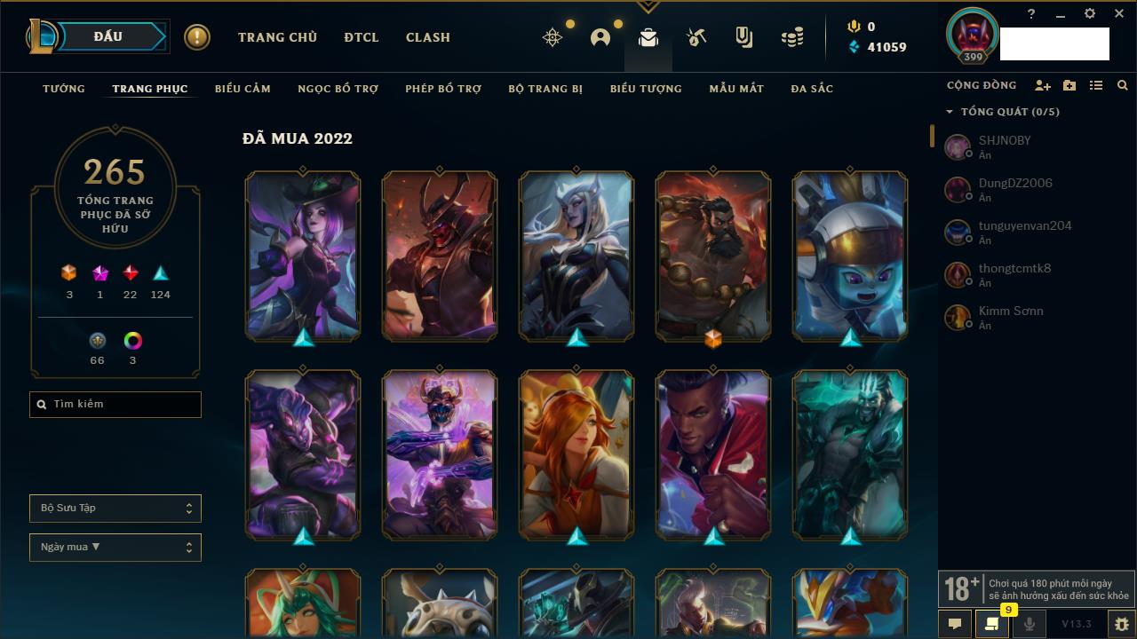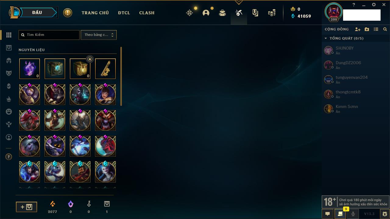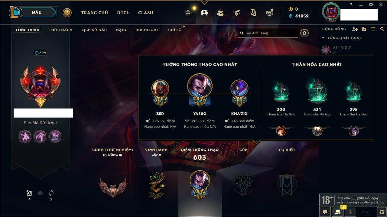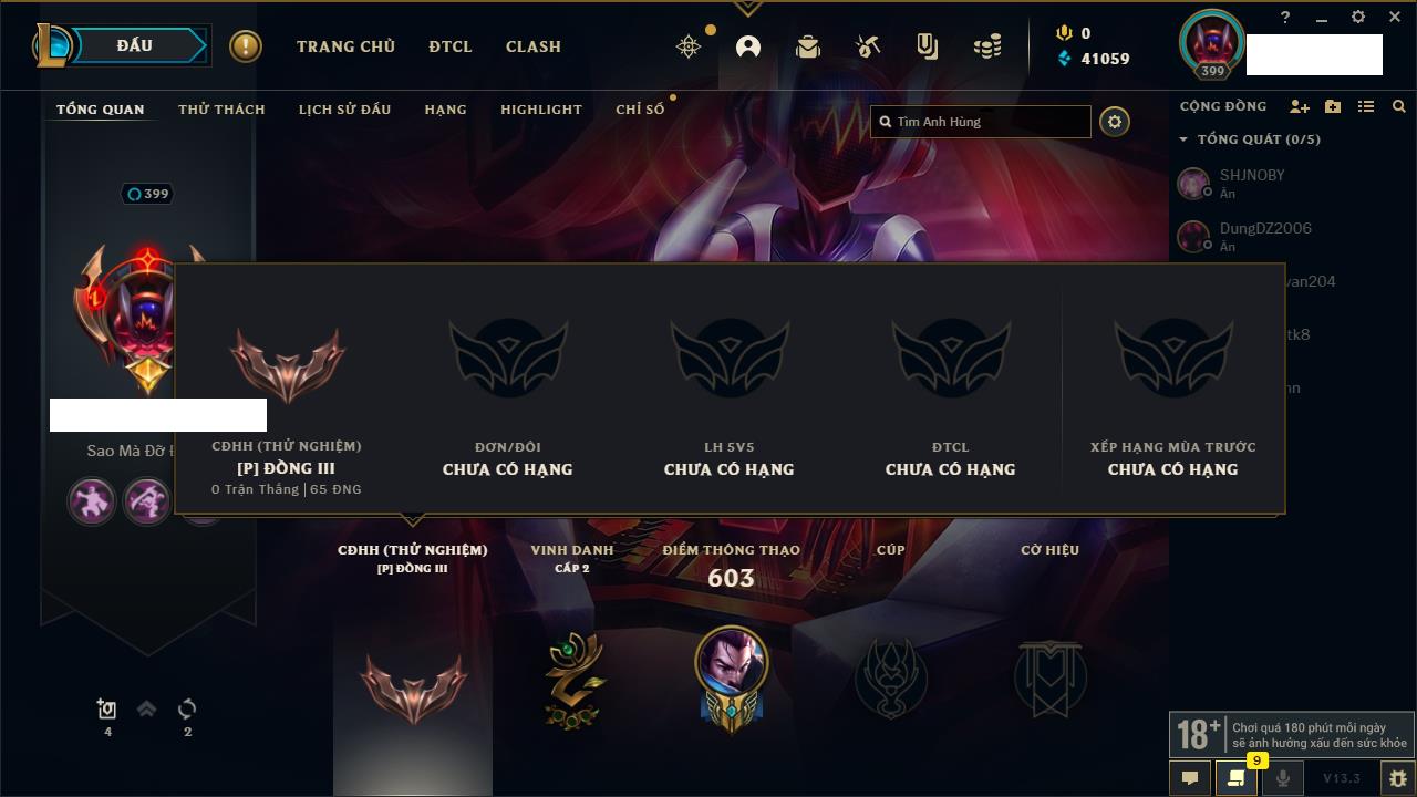 Rank Đơn: Vàng IIIKhung: BạcTướng: 171 - Còn 101359 THXTrang Phục: 88Rank ĐTCL: Kim Cương IVLinh Thú: 200