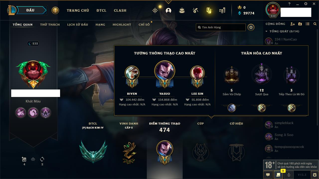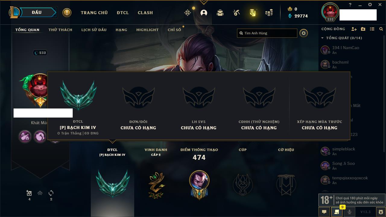 Rank Đơn: Vàng IIKhung: Bạch kimTướng: 172 - Còn 123420 THXTrang Phục: 231Rank ĐTCL: Bạch Kim IVLinh Thú: 213
