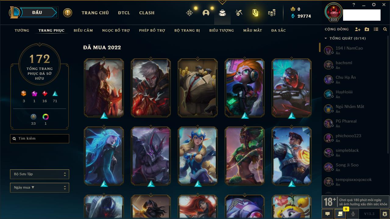 Rank Đơn: Vàng IIIKhung: VàngTướng: 172 - Còn 200315 THXTrang Phục: 87Rank ĐTCL: Chưa RankLinh Thú: 136
