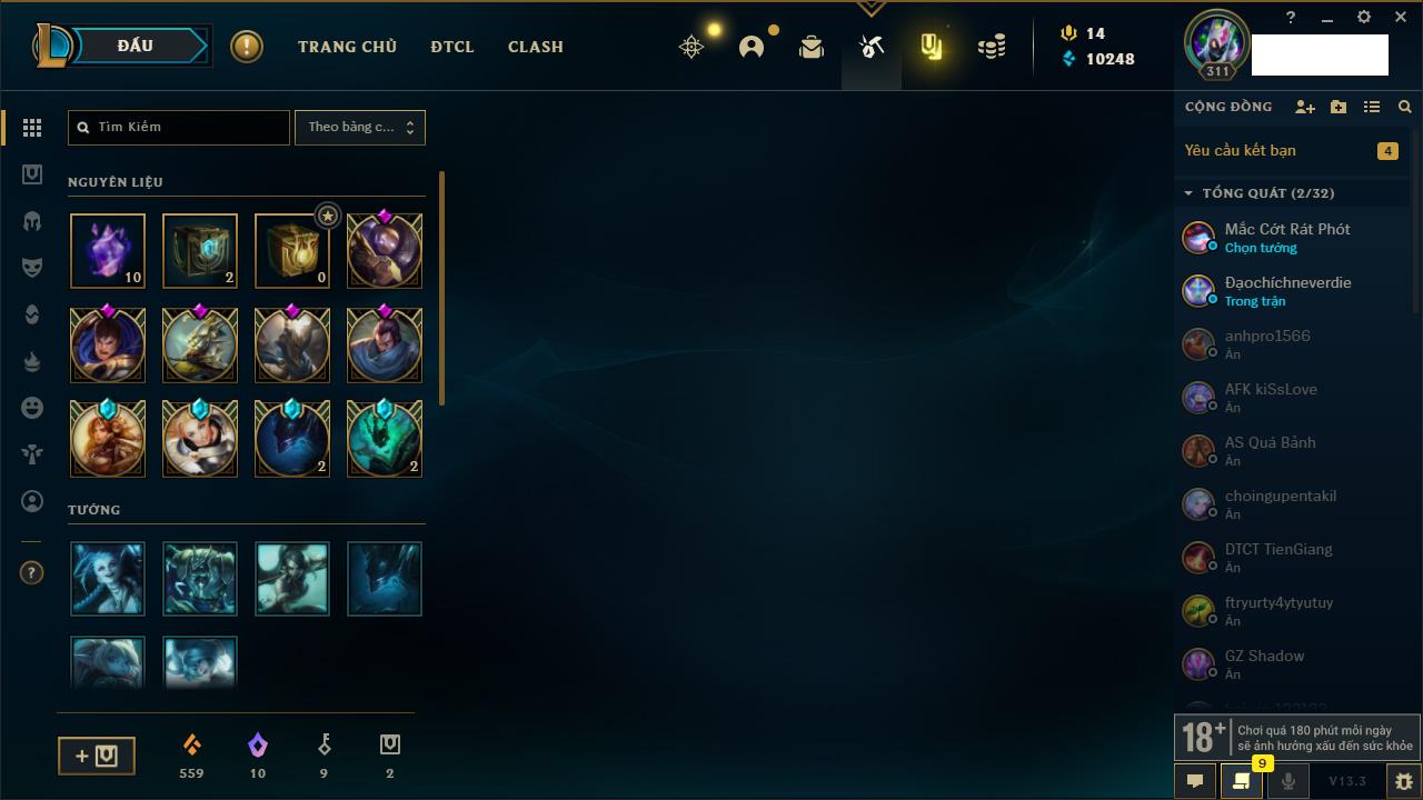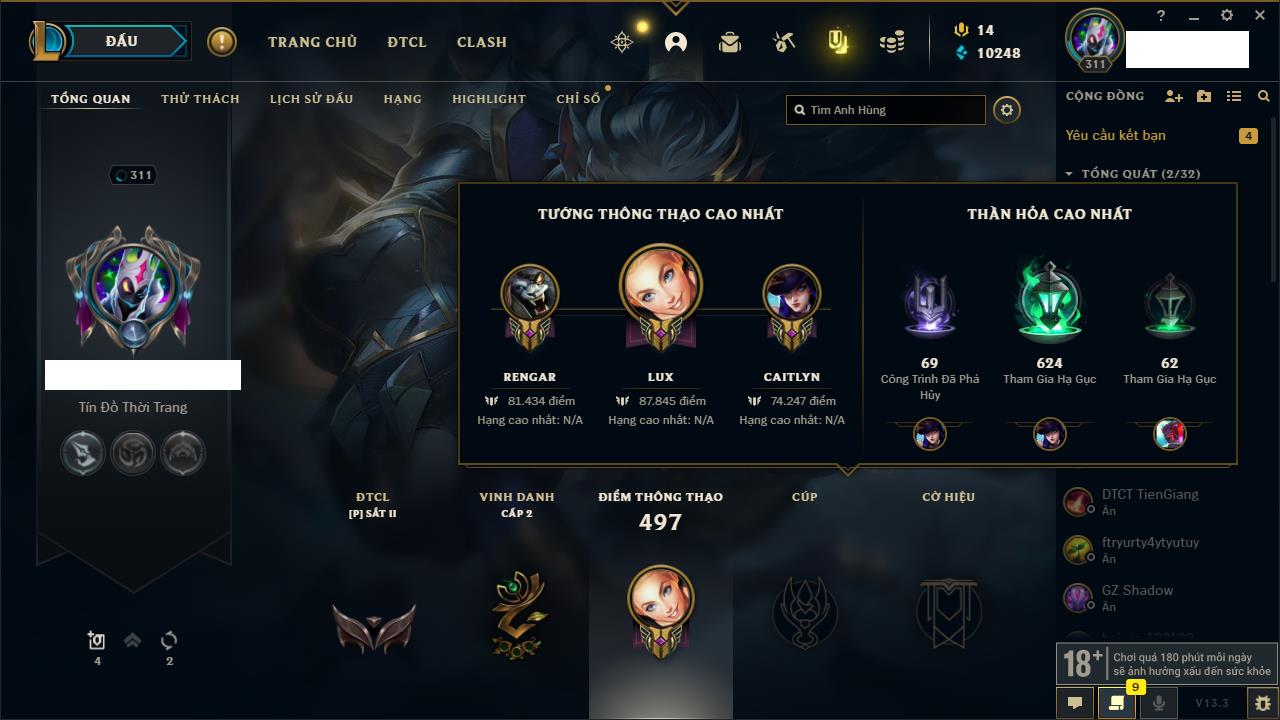 Rank Đơn: Bạc IVKhung: BạcTướng: 171 - Còn 102637 THXTrang Phục: 169Rank ĐTCL: Vàng IILinh Thú: 127