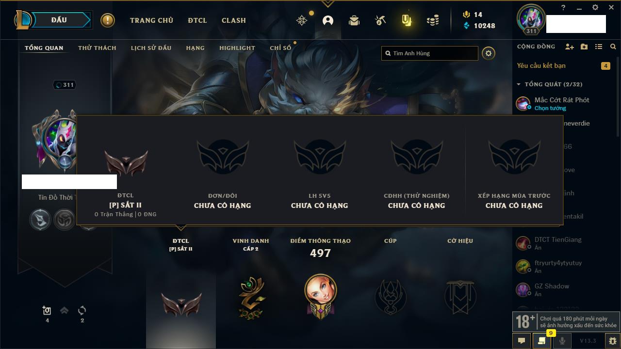 Rank Đơn: Bạc IVKhung: BạcTướng: 171 - Còn 161685 THXTrang Phục: 139Rank ĐTCL: Đồng ILinh Thú: 51