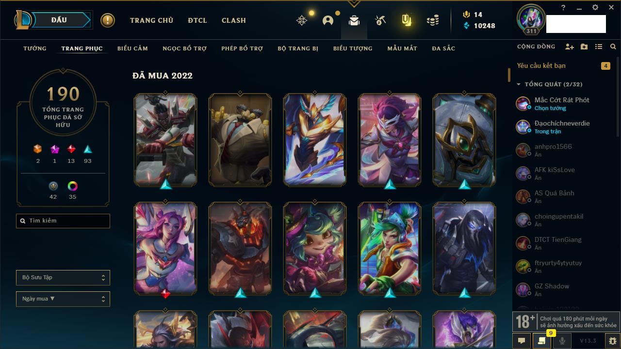 Rank Đơn: Vàng IVKhung: VàngTướng: 170 - Còn 42912 THXTrang Phục: 159Rank ĐTCL: Chưa RankLinh Thú: 22