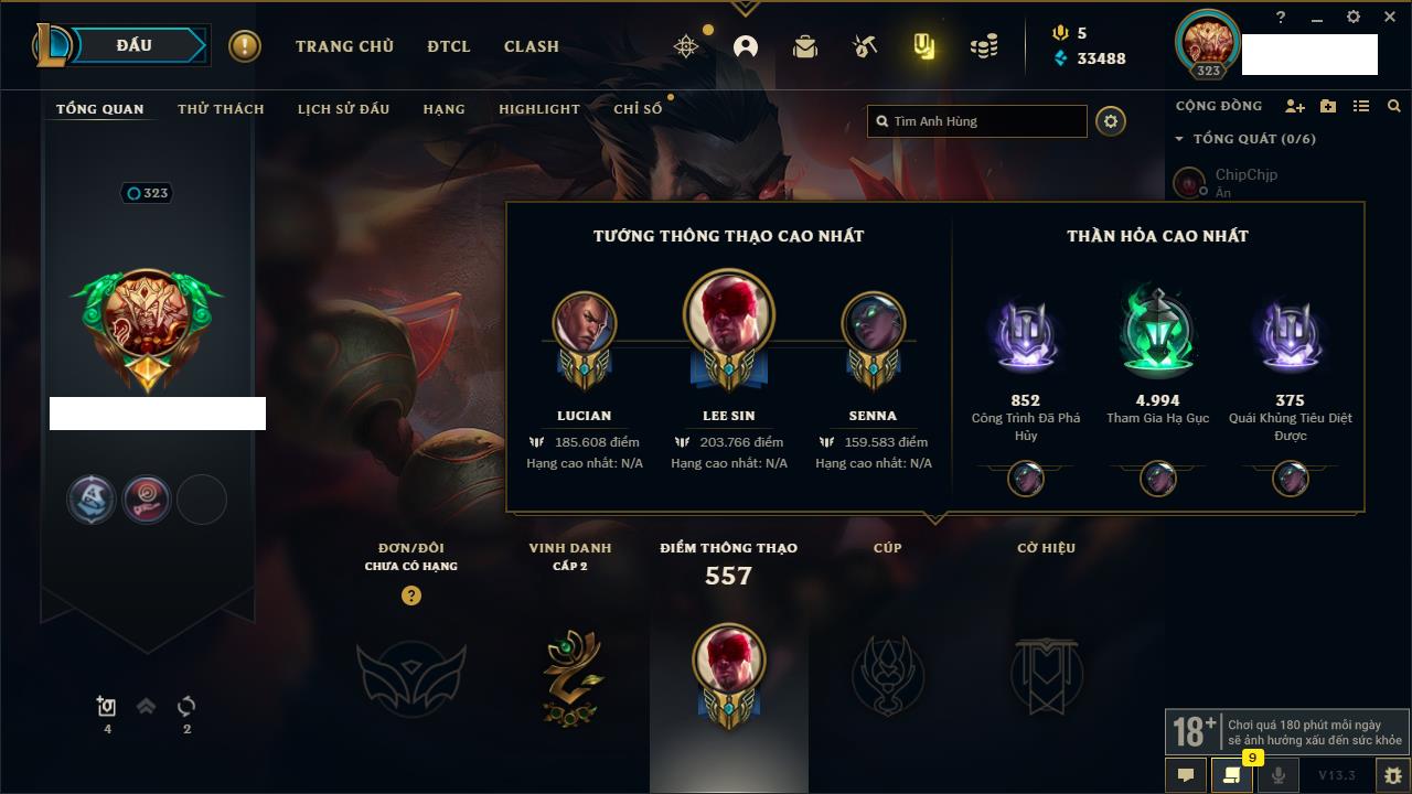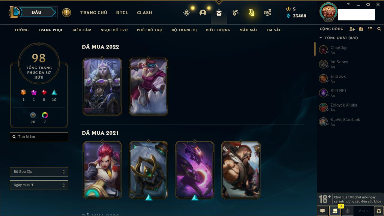 Rank Đơn: Chưa RankKhung: Chưa có khungTướng: 170 - Còn 72514 THXTrang Phục: 202Rank ĐTCL: Chưa RankLinh Thú: 191