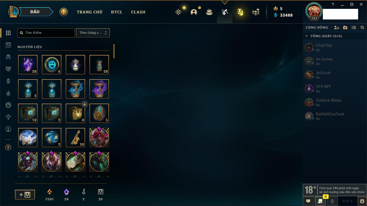 Rank Đơn: Chưa rank mùa nàoKhung: Chưa có khungTướng: 0 - Còn 0 THXTrang Phục: 0Rank ĐTCL: Chưa RankLinh Thú: 6