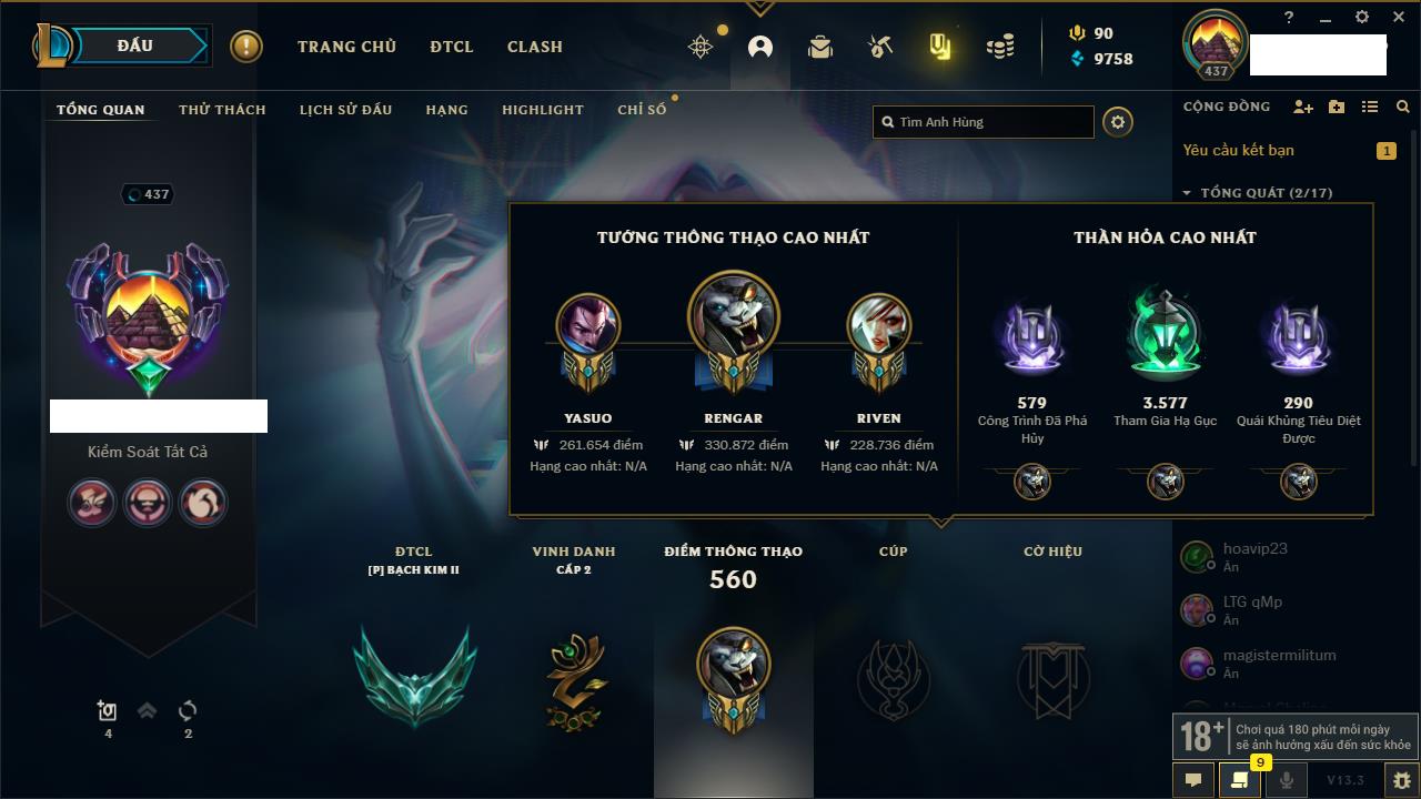 Rank Đơn: Bạch Kim IVKhung: VàngTướng: 171 - Còn 130578 THXTrang Phục: 253Rank ĐTCL: Chưa RankLinh Thú: 20