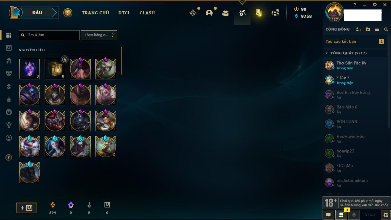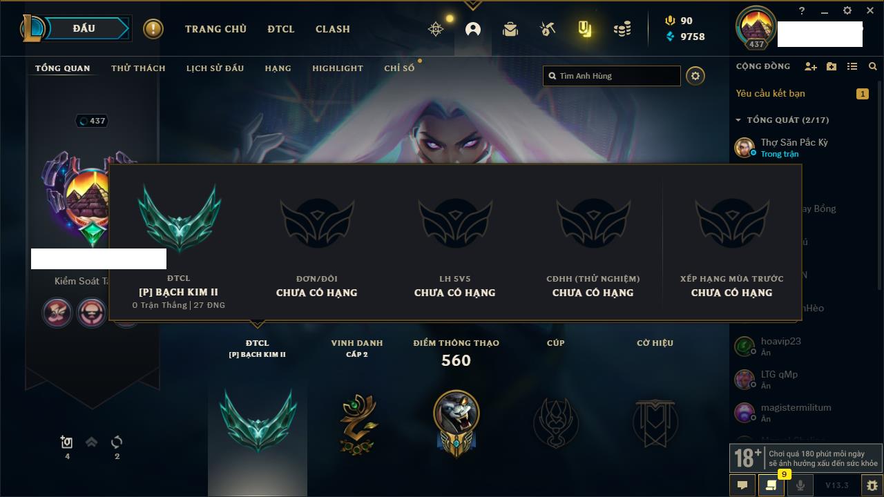 Rank Đơn: Bạch Kim IVKhung: VàngTướng: 171 - Còn 130280 THXTrang Phục: 226Rank ĐTCL: Kim Cương IVLinh Thú: 183