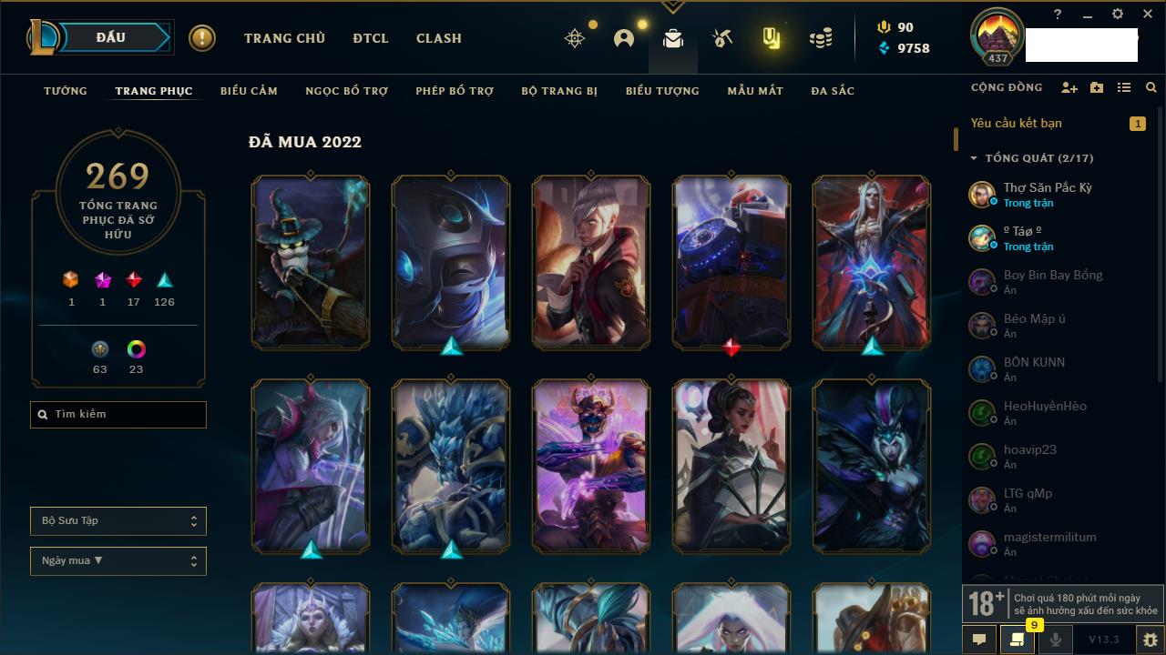 Rank Đơn: Vàng IIKhung: VàngTướng: 171 - Còn 219803 THXTrang Phục: 254Rank ĐTCL: Chưa RankLinh Thú: 78
