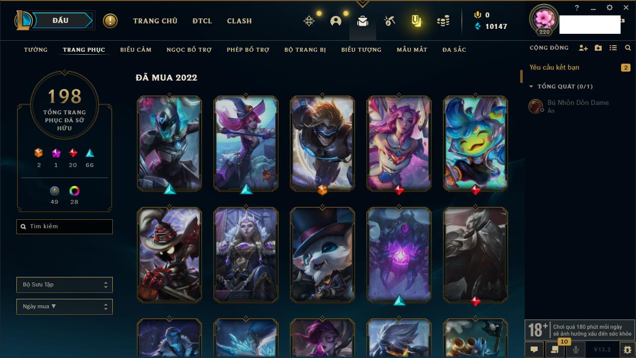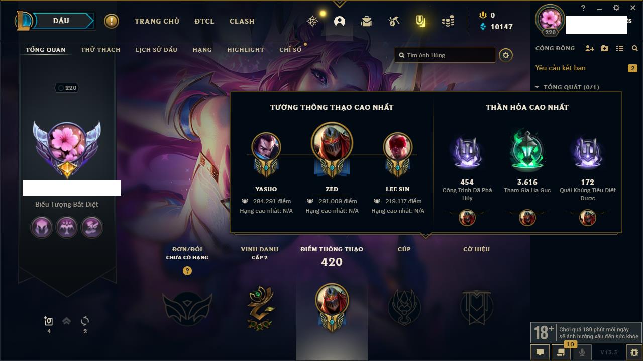 Rank Đơn: Bạc IIIKhung: BạcTướng: 168 - Còn 101710 THXTrang Phục: 184Rank ĐTCL: Chưa RankLinh Thú: 17