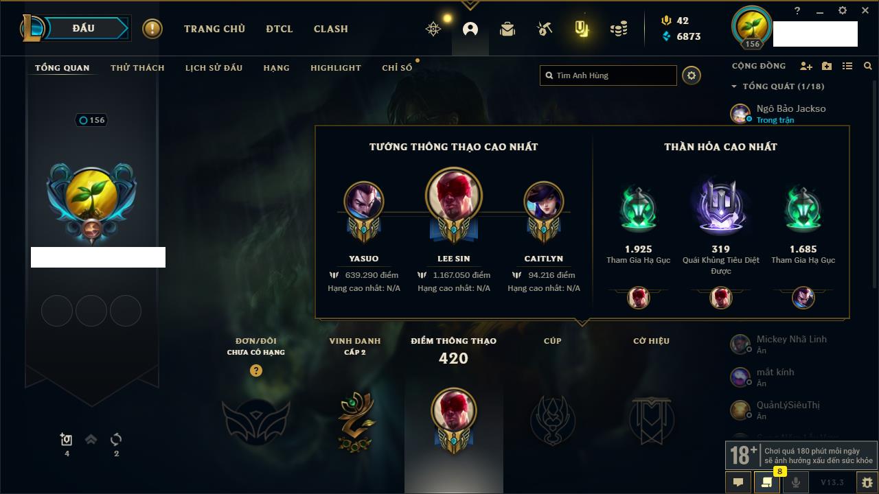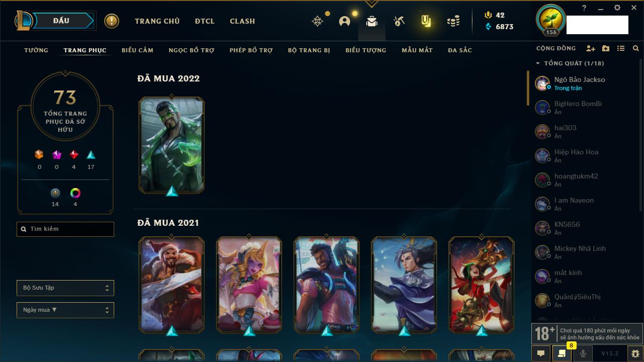Rank Đơn: Vàng IVKhung: VàngTướng: 171 - Còn 48721 THXTrang Phục: 171Rank ĐTCL: Chưa RankLinh Thú: 27