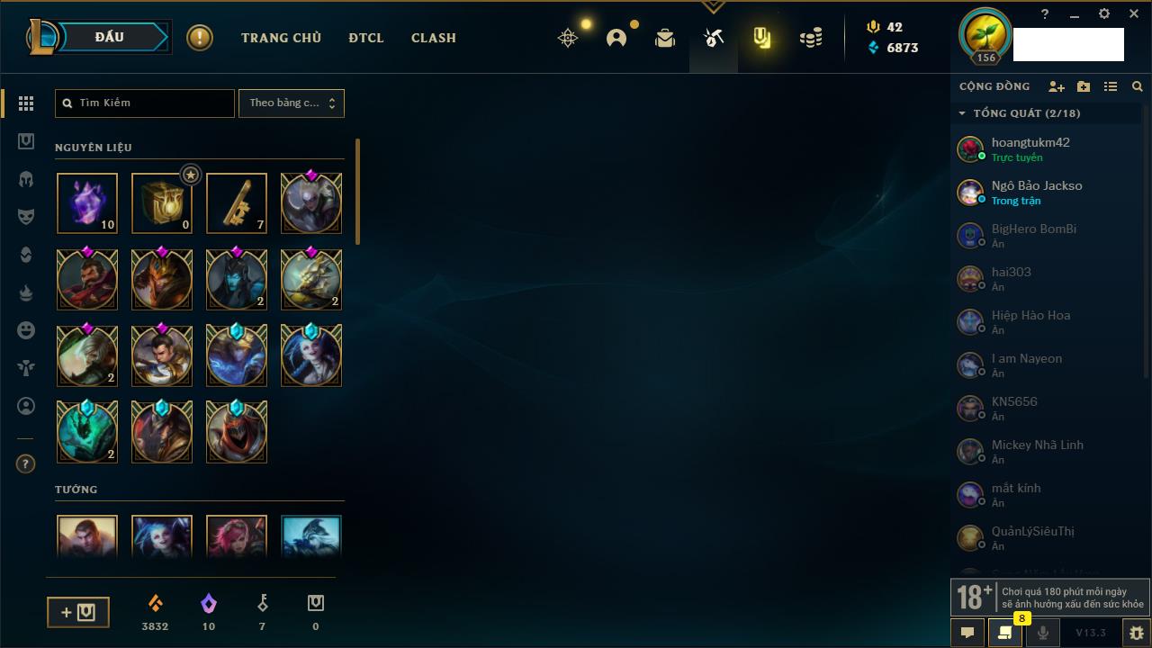 Rank Đơn: Bạc IVKhung: VàngTướng: 172 - Còn 358384 THXTrang Phục: 177Rank ĐTCL: Lục Bảo IILinh Thú: 211