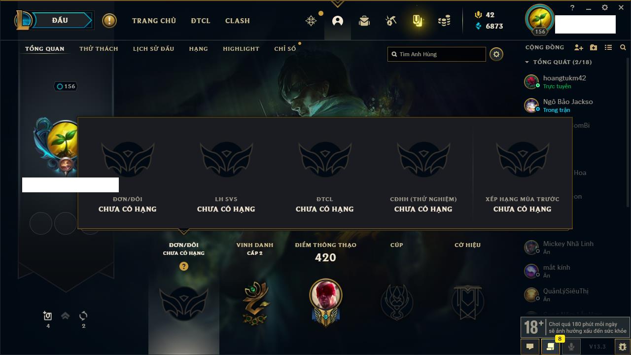 Rank Đơn: Vàng IVKhung: BạcTướng: 171 - Còn 231097 THXTrang Phục: 180Rank ĐTCL: Vàng IVLinh Thú: 110