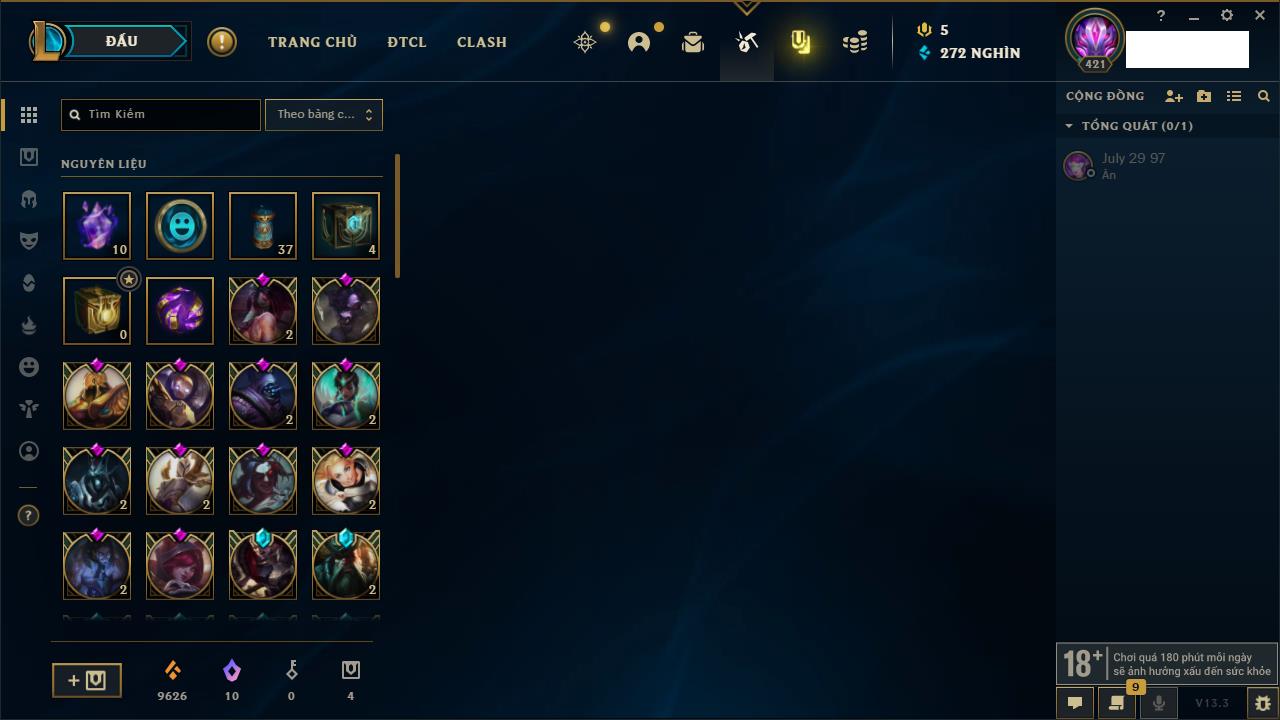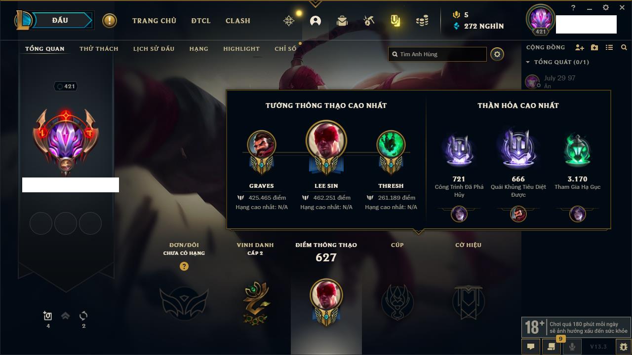 Rank Đơn: Chưa RankKhung: Chưa có khungTướng: 157 - Còn 6783 THXTrang Phục: 50Rank ĐTCL: Chưa RankLinh Thú: 37
