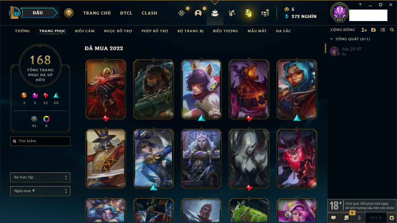 Rank Đơn: Chưa RankKhung: Chưa có khungTướng: 168 - Còn 70824 THXTrang Phục: 155Rank ĐTCL: Chưa RankLinh Thú: 53