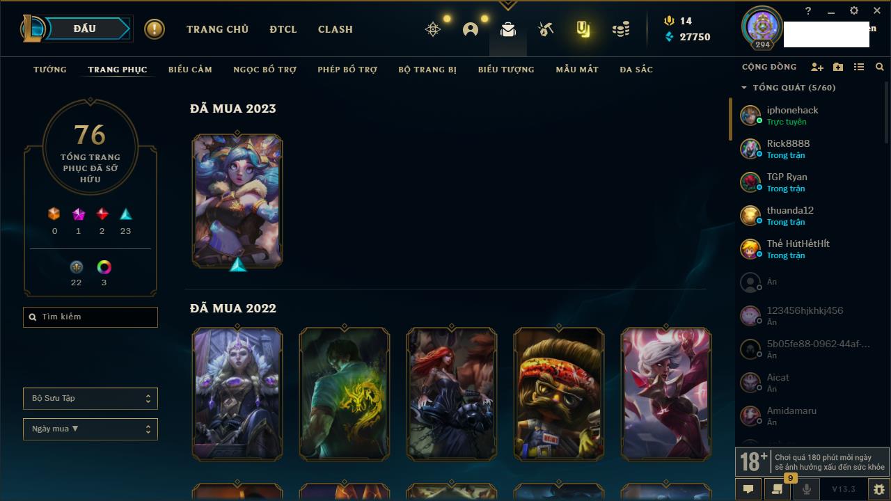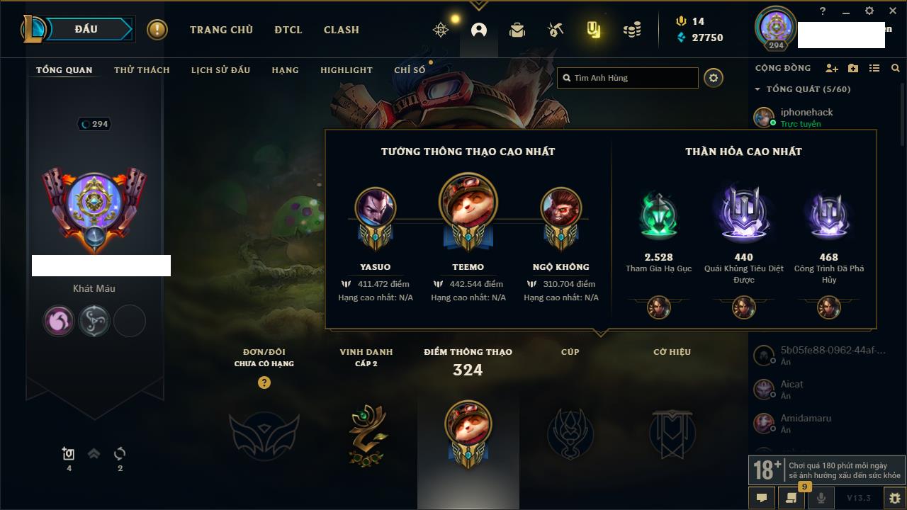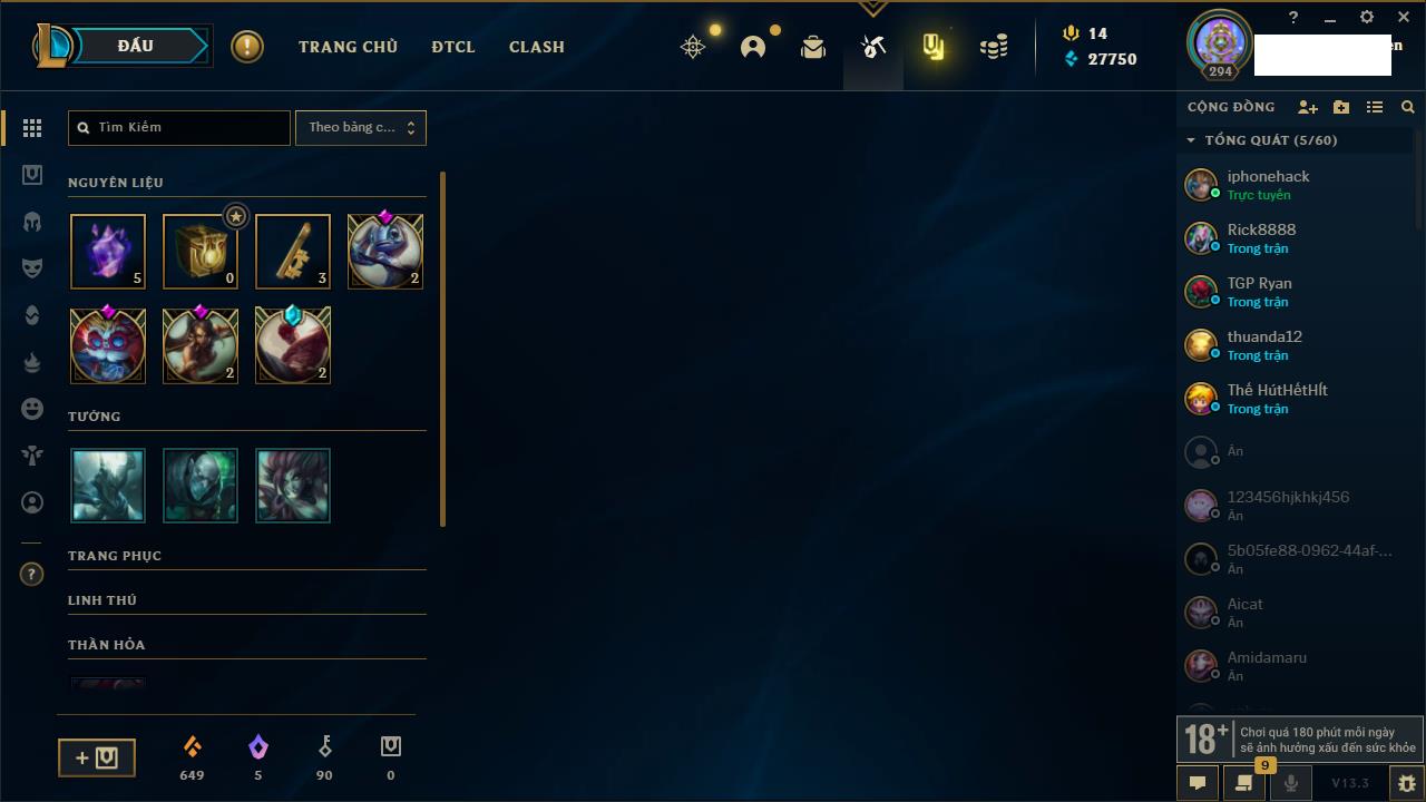Rank Đơn: Chưa rank mùa nàoKhung: Chưa có khungTướng: 3 - Còn 34550 THXTrang Phục: 0Rank ĐTCL: Bạch Kim IVLinh Thú: 41