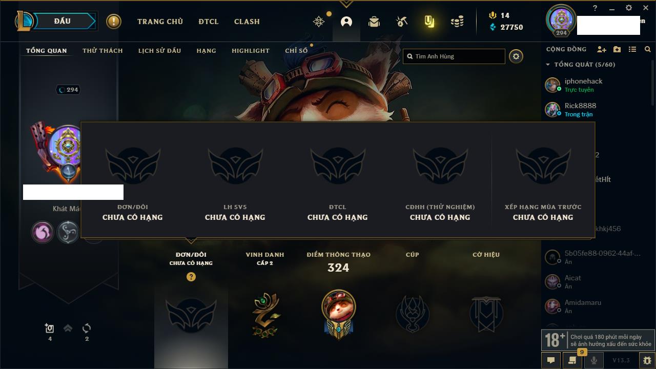 Rank Đơn: Chưa rank mùa nàoKhung: Chưa có khungTướng: 3 - Còn 32650 THXTrang Phục: 0Rank ĐTCL: Bạch Kim IVLinh Thú: 66