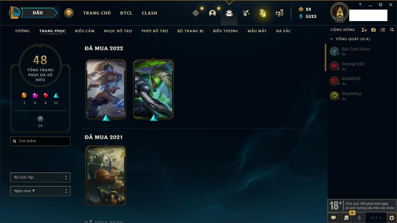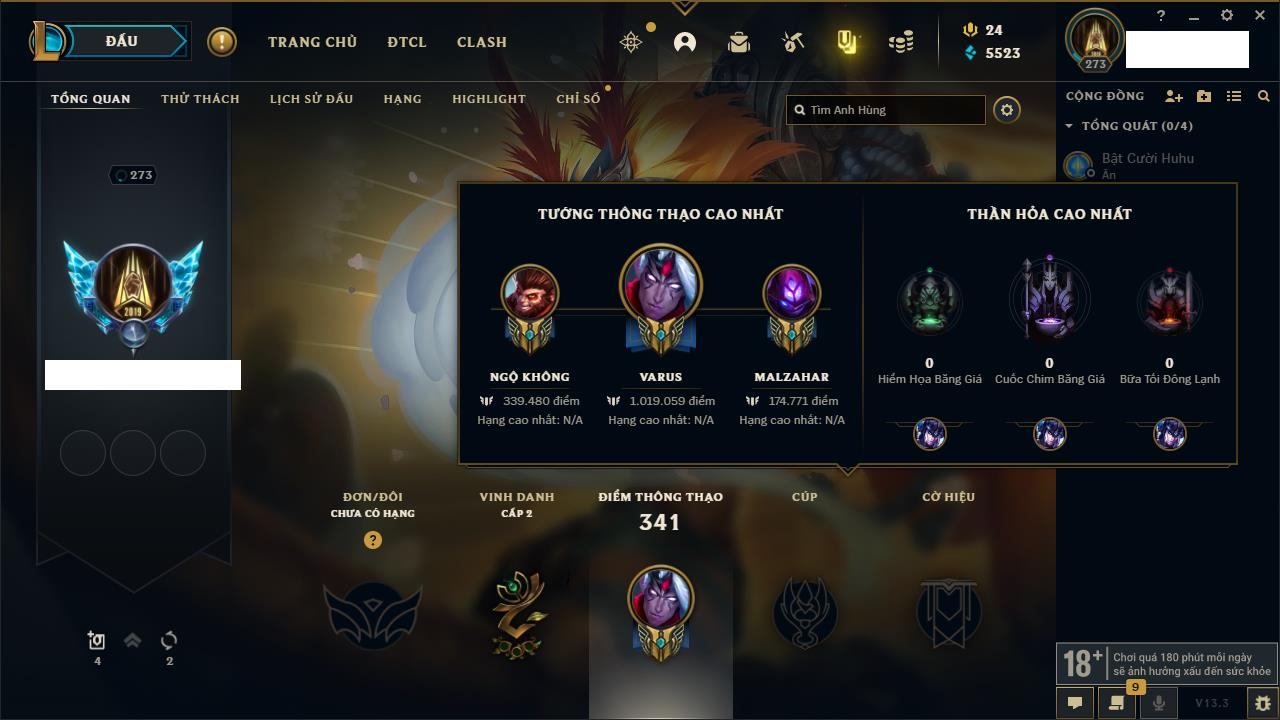 Rank Đơn: Đồng IKhung: ĐồngTướng: 168 - Còn 11447 THXTrang Phục: 245Rank ĐTCL: Chưa RankLinh Thú: 53