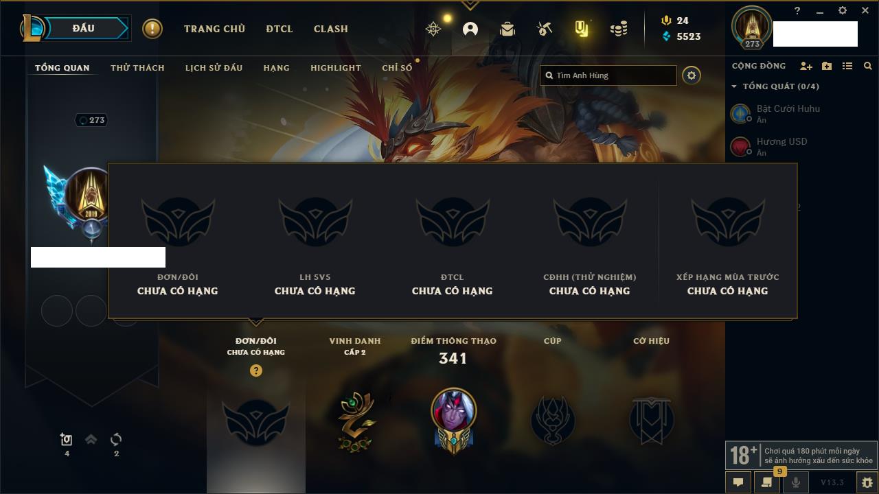 Rank Đơn: Vàng IIIKhung: BạcTướng: 171 - Còn 101359 THXTrang Phục: 88Rank ĐTCL: Kim Cương IVLinh Thú: 200