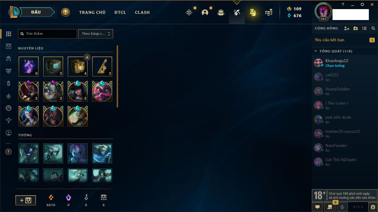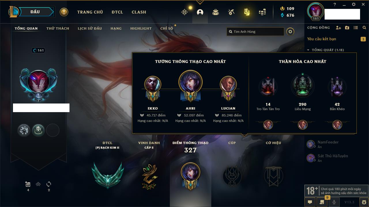Rank Đơn: Chưa RankKhung: Chưa có khungTướng: 157 - Còn 6783 THXTrang Phục: 50Rank ĐTCL: Chưa RankLinh Thú: 37
