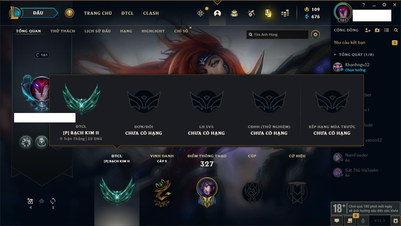 Rank Đơn: Vàng IVKhung: VàngTướng: 146 - Còn 89110 THXTrang Phục: 63Rank ĐTCL: Vàng IIILinh Thú: 41