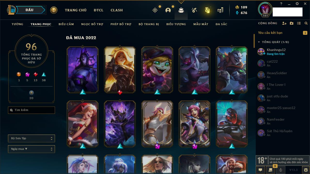 Rank Đơn: Vàng IIIKhung: VàngTướng: 170 - Còn 33222 THXTrang Phục: 136Rank ĐTCL: Chưa RankLinh Thú: 40