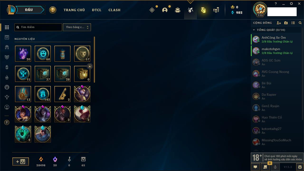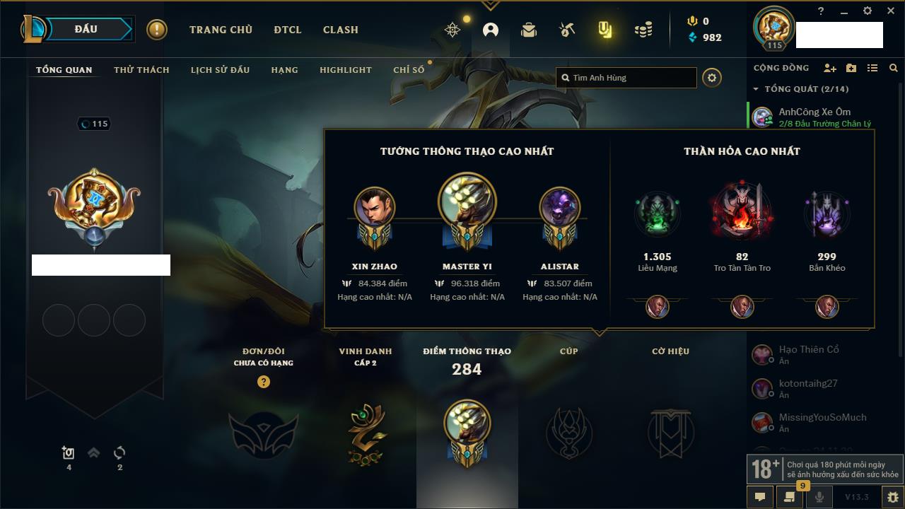 Rank Đơn: Bạch Kim IIIKhung: Bạch kimTướng: 171 - Còn 251383 THXTrang Phục: 229Rank ĐTCL: Sắt IILinh Thú: 51