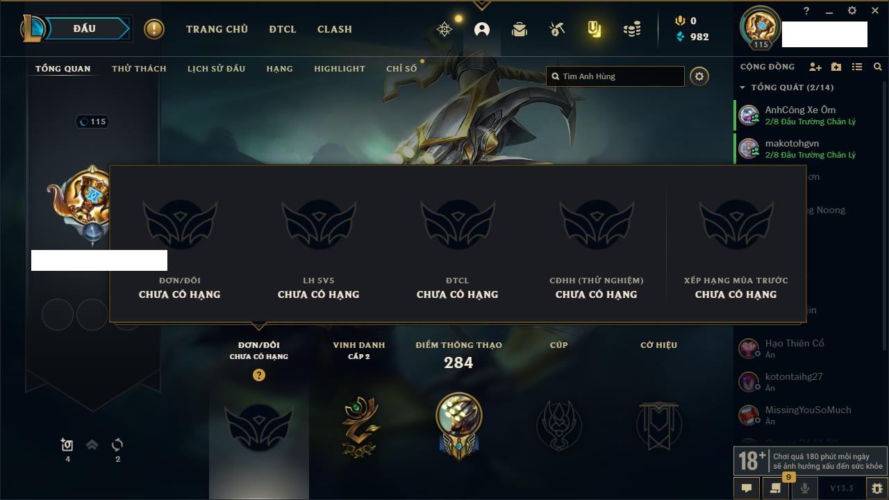 Rank Đơn: Vàng IKhung: BạcTướng: 171 - Còn 60584 THXTrang Phục: 286Rank ĐTCL: Vàng IIILinh Thú: 117