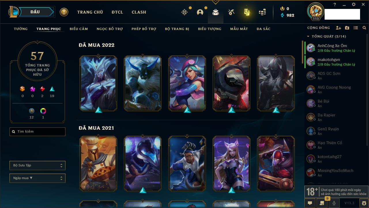 Rank Đơn: Vàng IIIKhung: VàngTướng: 171 - Còn 88128 THXTrang Phục: 329Rank ĐTCL: Chưa RankLinh Thú: 41