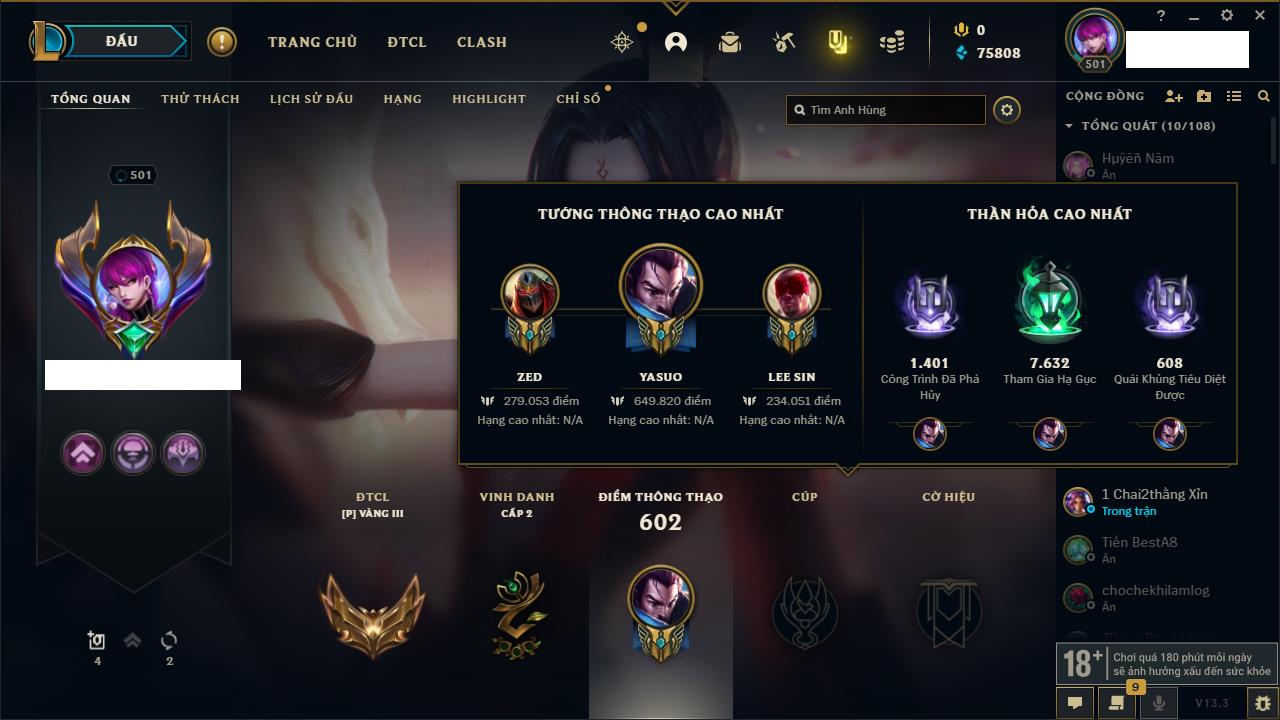 Rank Đơn: Lục Bảo IVKhung: Bạch kimTướng: 171 - Còn 128452 THXTrang Phục: 193Rank ĐTCL: Bạc IIILinh Thú: 100